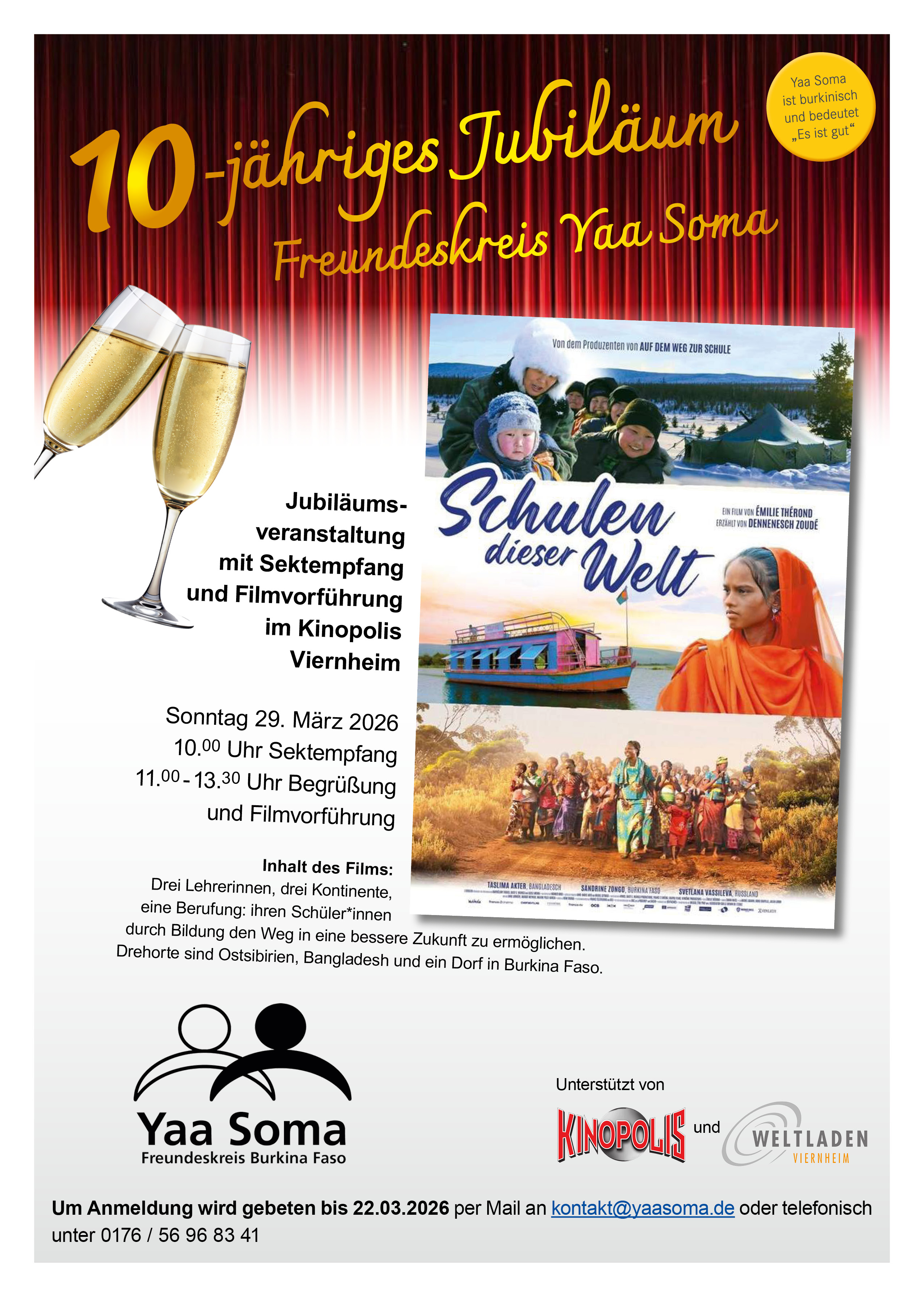 Die Jubiläumsveranstaltung am 29. März um 10:00 Uhr findet in Kooperation mit dem KINOPOLIS und dem Viernheimer WELTLADEN statt und beginnt mit einem Sektempfang. Im Anschluss folgt eine Vorführung des Films „Schulen der Welt“. Der Dokumentarfilm begleitet drei Lehrerinnen in Ostsibirien, Bangladesch und auf ein Dorf in Burkina Faso. Alle drei Frauen haben eine Berufung: Kindern durch Bildung den Weg in eine bessere Zukunft zu ermöglichen.