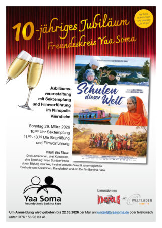 Anlässlich des 10-jährigen Bestehens, lädt YAA SOMA alle ein, die sich mit dem Freundeskreis und den Menschen in Burkina Faso verbunden fühlen oder Näheres über die Arbeit des Vereins erfahren möchten: