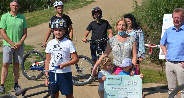 Spendenübergabe zur „Erweiterung der Bike-Area im Familiensportpark West um einen Asphalt-Pumptrack“ von der Baugenossenschaft, der Bürgerstiftung und der BB-Bank