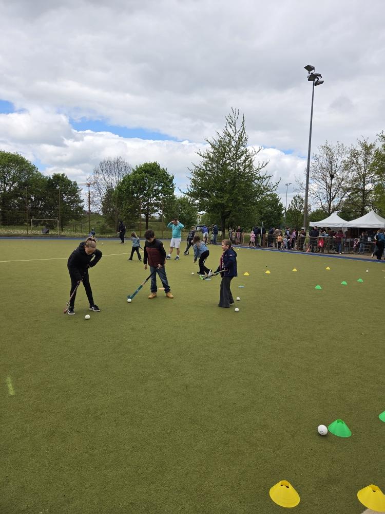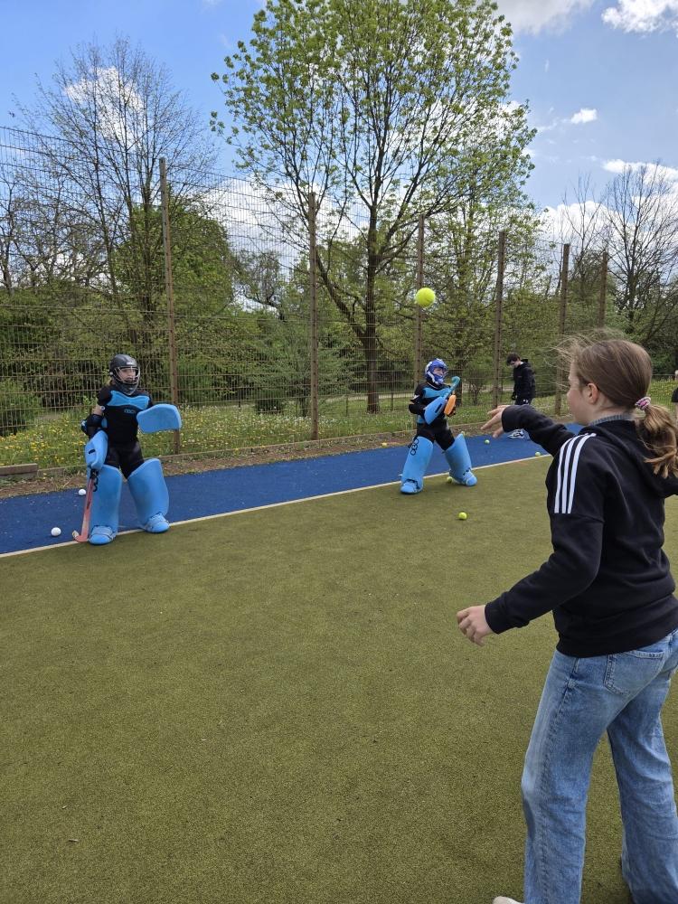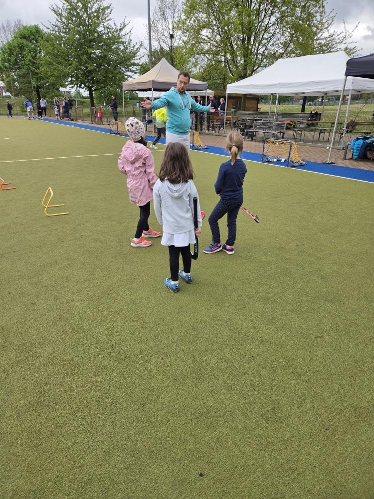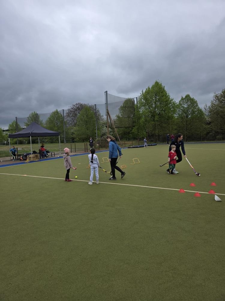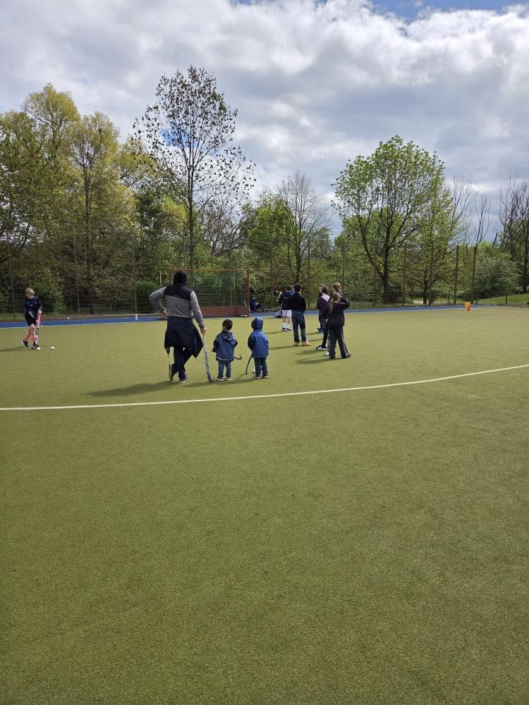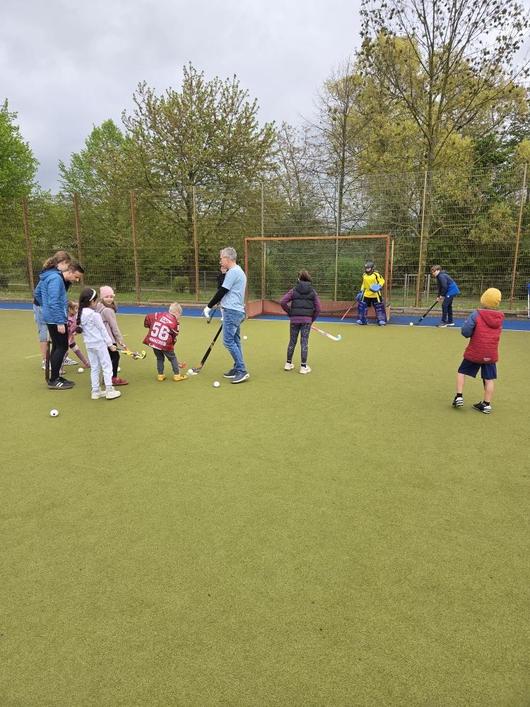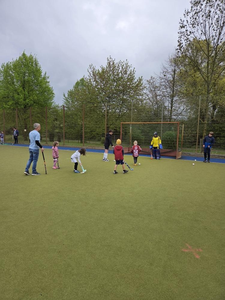 Kurzum, der Schnuppertag wurde ein gewaltiger Erfolg: in der Hochphase tummelten sich vierzig Kinder auf dem Platz und wurden in verschiedenen spannenden Übungen von den Kindern und Eltern aus dem Verein angeleitet. Nachdem die Kinder das Eis gebrochen hatten, fanden auch einige Eltern den Weg auf dem Platz und übten sich im Schwingen des Krummstocks. Mindestens zwei Eltern waren so fasziniert, dass sie auch beim Elternhockey vorbeischauen wollen. Zwei Kinder waren so begeistert, dass sie sogar in Torwartausrüstungen schlüpften und erste Schritte im Tor machten.