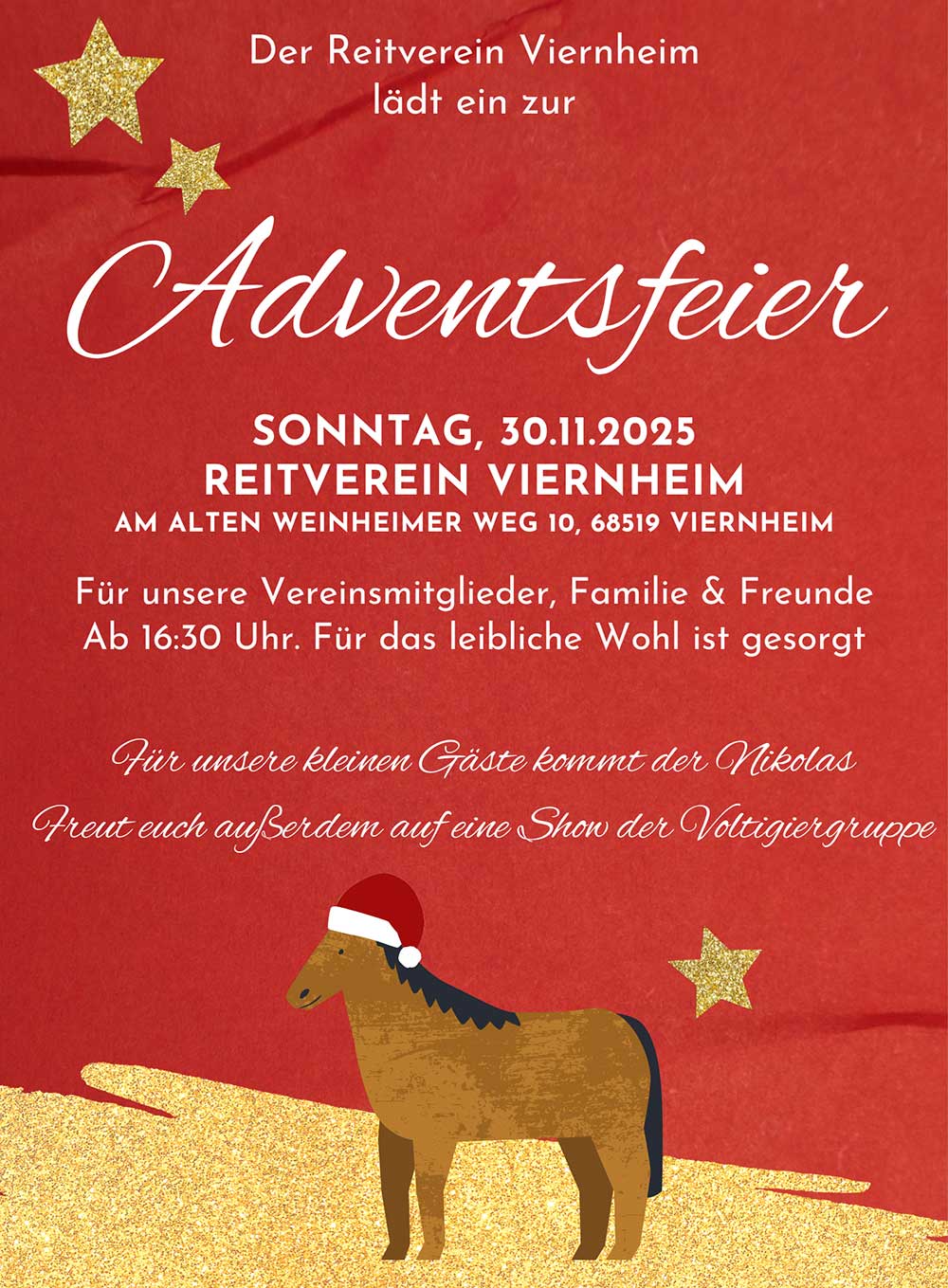 Viernheim (Reit- und Fahrverein Viernheim e.V.) – In diesem Jahr läuft es im Reitverein Viernheim ein wenig anders: Anstelle des traditionellen Weihnachtsreitens laden wir alle Vereinsmitglieder, Freunde und Familien herzlich zu unserer Adventsfeier am Sonntag, den 1. Advent ab 16:30 Uhr ein (Reitverein Viernheim, Alter Weinheimer Weg 10)
