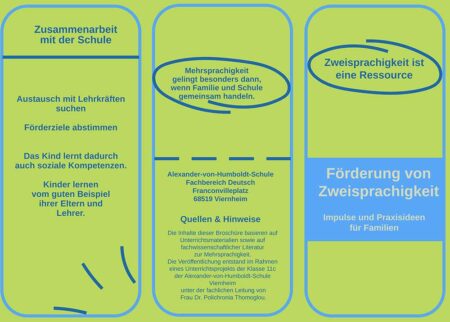 Um ihr Wissen praxisnah einzusetzen und weiterzugeben, erarbeiteten die Schülerinnen und Schüler in Kleingruppen Broschüren zum Thema Zweisprachigkeit, die sich an Eltern sowie an jüngere Jahrgänge richten. Die beste Broschüre der Klasse wurde ausgewählt und an Viernheimer Grundschulen sowie an die fünften und sechsten Klassen der Alexander-von-Humboldt-Schule verteilt.