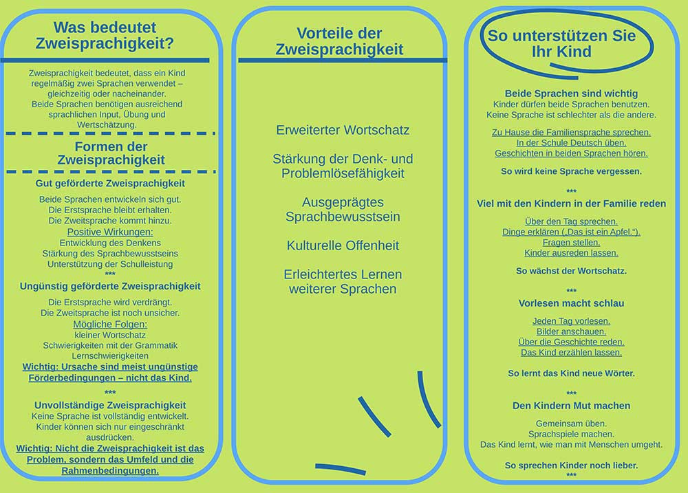 Mit alltagsnahen Tipps ermutigt die Broschüre Eltern, ihre Kinder sprachlich aktiv zu begleiten – durch Gespräche, gemeinsames Lesen und spielerische Übungen. So setzt die Klasse 11c ein klares Zeichen: Sprache verbindet. Zweisprachigkeit ist eine Chance.