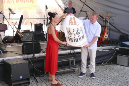Anstelle eines klassischen Blumenstraußes – bei hochsommerlichen Temperaturen durchaus eine Herausforderung – überreichte Baaß ein großformatiges Plakat mit einer Torte, das gleichzeitig als Gutschein galt. „Das Foto sieht zwar eher nach Hochzeitstorte aus, aber das dürfte kein Problem sein, schließlich sind Sie auf besondere Art mit der Musikschule verheiratet“, so Baaß augenzwinkernd. Im Anschluss spielte Sophia Kramer, Stipendiatin und Schülerin Wendels, auf der Bühne die eindrucksvolle „Kumru Ballad“ von Fazıl Say – eine musikalische Hommage an ihre Mentorin, bevor es dann mit dem offiziellen Programm von „City Jam“ weiterging.