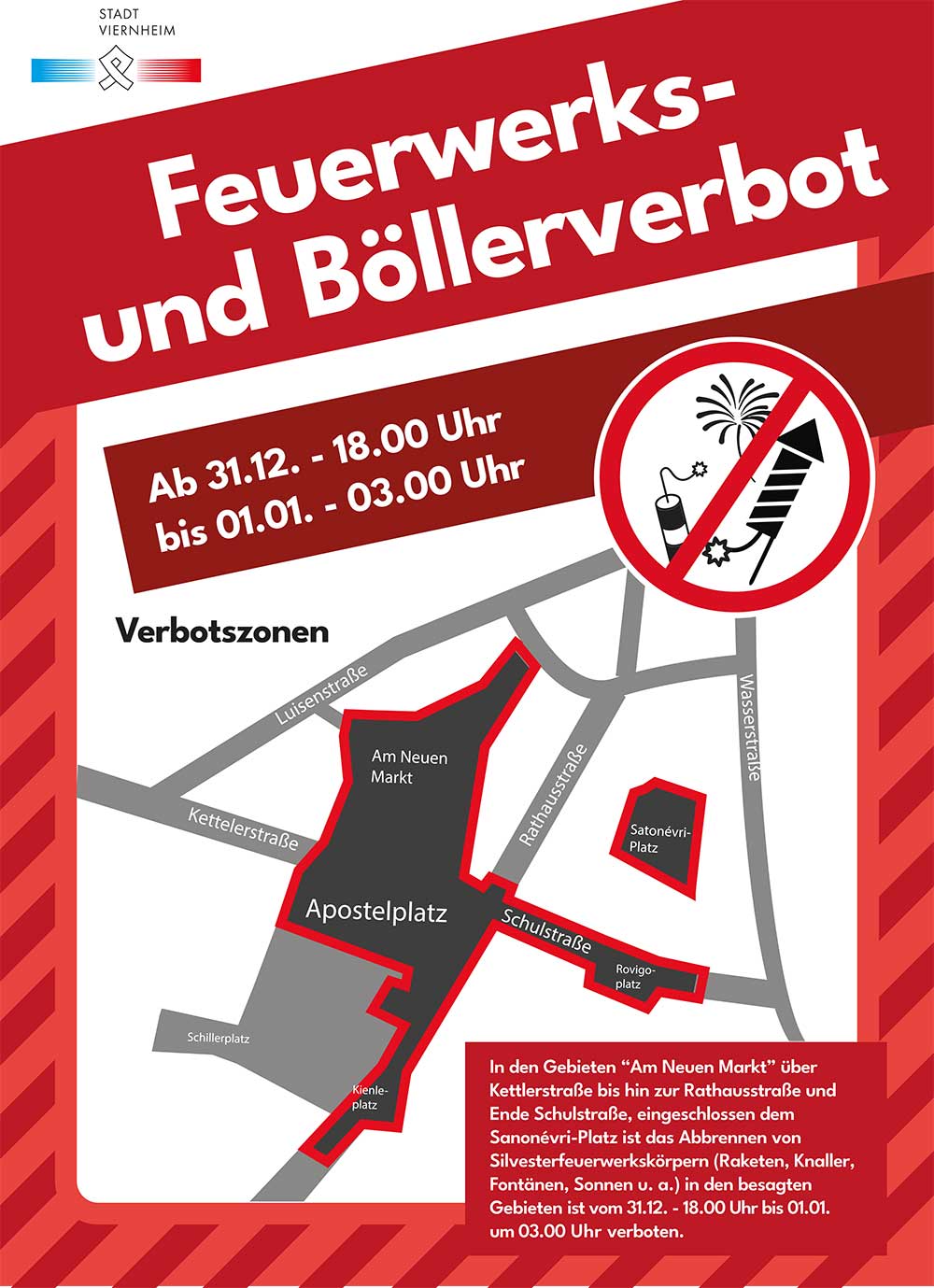 Viernheim (Stadt Viernheim) – Die Stadt Viernheim erlässt für die kommende Silvesternacht 2025/26 ein gezieltes Verbot für das Abrennen von Feuerwerkskörpern in Teilen der Innenstadt. Das Verbot gilt am 31. Dezember 2025 ab 18:00 Uhr und endet am 1. Januar 2026 um 3:00 Uhr. Es betrifft den Bereich rund um die Apostelkirche, den Apostelplatz, den Satonévri-Platz, die Rathausstraße, die Schulstraße sowie den Parkplatz hinter dem „Alten Rathaus“.
