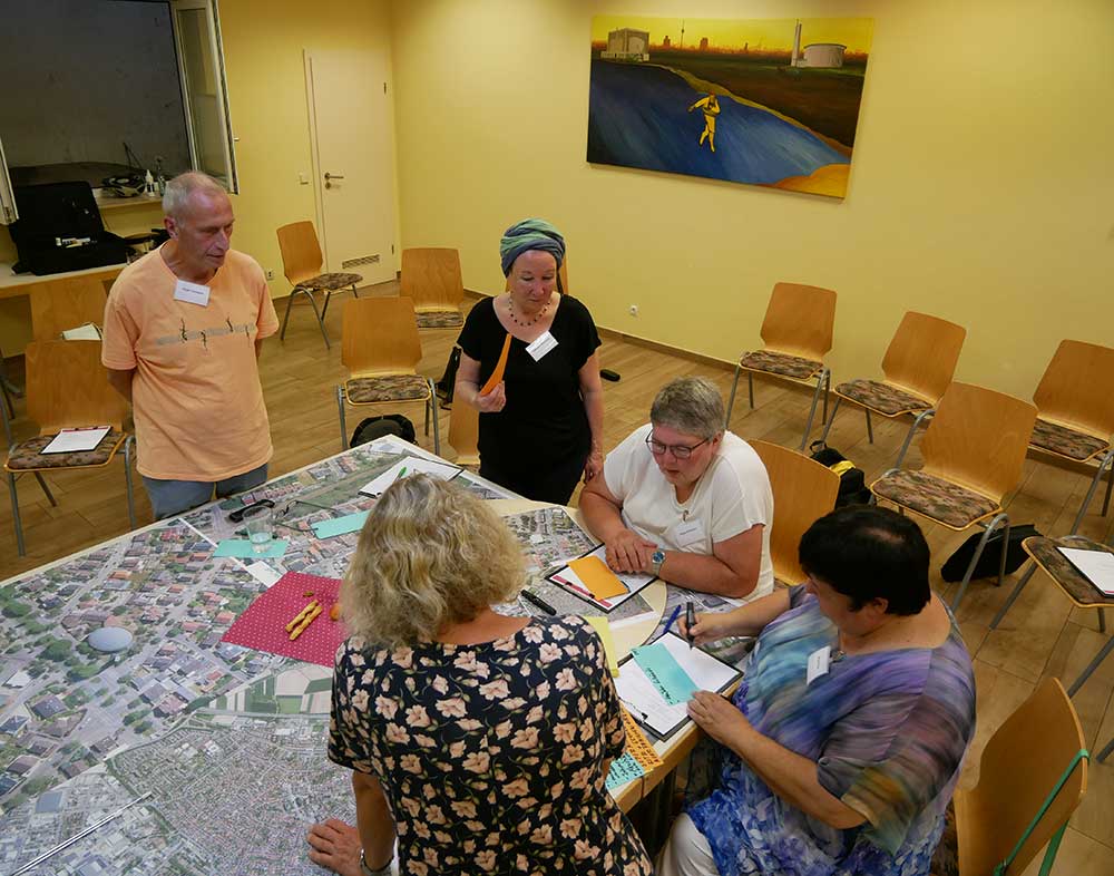 Besonderes Augenmerk lag an diesem Abend auf der intensiven Auseinandersetzung mit den einzelnen Kirchenstandorten: Die Teilnehmenden diskutierten deren besondere Verbindung zu ihrem jeweiligen Umfeld, über die Wirkung und Herausforderungen sowie die Eigenheiten der jeweiligen Kirchorte. In kleinen Gruppen wurde herausgearbeitet, was die Gebäude für die Menschen und die Nachbarschaft bedeuten, welche Rolle sie innerhalb der Stadt einnehmen und was sie zu unverwechselbaren „vertrauten Orten“ macht. Dabei wurden vielfältige Gedanken und Anregungen gesammelt, die auf Karten und einem Stadtplan verortet und später im Plenum vorgestellt wurden. Ziel war es dabei nicht, sofort neue Nutzungsideen zu entwickeln, sondern zunächst ein klares Bild der jeweiligen Orte, ihrer Voraussetzungen und Besonderheiten zu gewinnen. Dieses Wissen schafft eine tragfähige Grundlage für spätere Ideen und Entscheidungen.