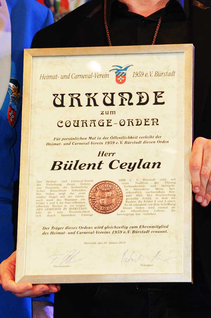 Bürstadt (vo) – Jedes Jahr wird vom Heimat- und Carneval Verein 1959 e. V. Bürstadt der Courage-Orden verliehen. Am Sonntag, 20. Januar 2019 war es wieder soweit. In diesem Jahr ging der Orden an Bülent Ceylan, der sich seit vielen Jahren für soziale Projekte einsetzt.