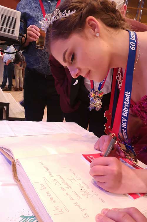 Auch eine Abordnung des „Club der Gemütlichen“ (CdG) war nach Bürstadt gefahren. Im Rahmen der Verleihung wurde auch der CdG-Kampagnenorden von der Viernheimer CdG- und Stadtprinzessin Selina I. „aus dem Hause Ellemiller“ an Bülent Ceylan überreicht. Auch ins Goldene Buch der Stadt Bürstadt durfte sich Selina I. eintragen.