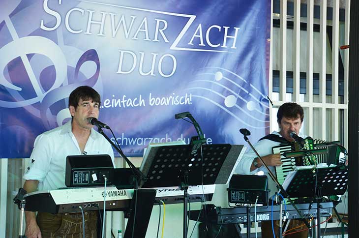 Mit dabei ist das „Schwarzach Duo“. Zum 25. Mal werden Voith Hermann und Franz Schneider für die musikalische Unterhaltung der Gäste sorgen. Diese können sich neben der Live-Musik auch wieder auf leckeres Essen und kühle Getränke freuen. Es gibt unter anderem die beliebten gegrillten Haxen, Fleischkäse mit Zwiebeln, Weißwurst mit Brezel, Rindswurst, Radi und Pommes frites. Sonntags wartet auch Kaffee und Kuchen auf die Gäste.