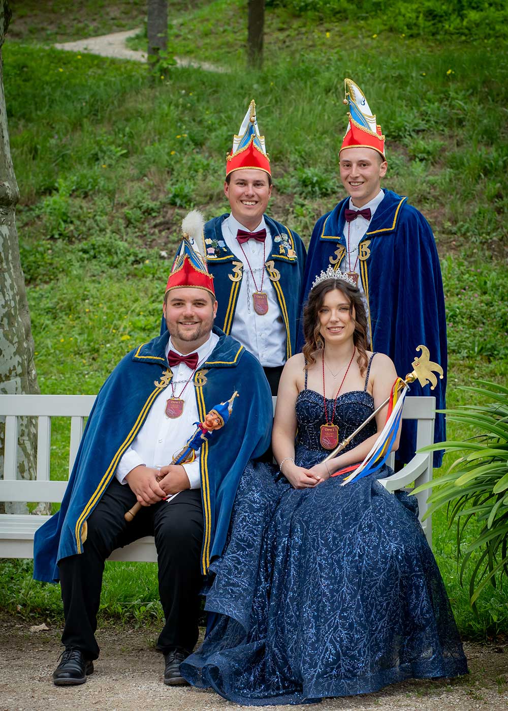 Seitdem läuft die Vorbereitung auf Hochtouren: Motto der Kampagne finden („66 Jahre Große 3, in Verne stets vorne mit dabei“), Fotoshooting im Fürstenlager Bensheim, Sektprobe mit Auswahl von „Flüssiges Konfetti“ (rosé, trocken) und „Sternspritzer“ (weiß, trocken), Gestaltung des Kampagnenordens und natürlich der Kauf der Prinzessinnenkleider: Drei glitzernde Roben in Blau, Grün und Rot – sowie ein altrosa Kleid für die Aftershow-Party.