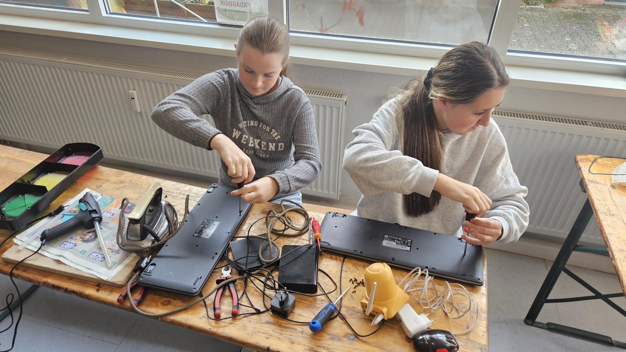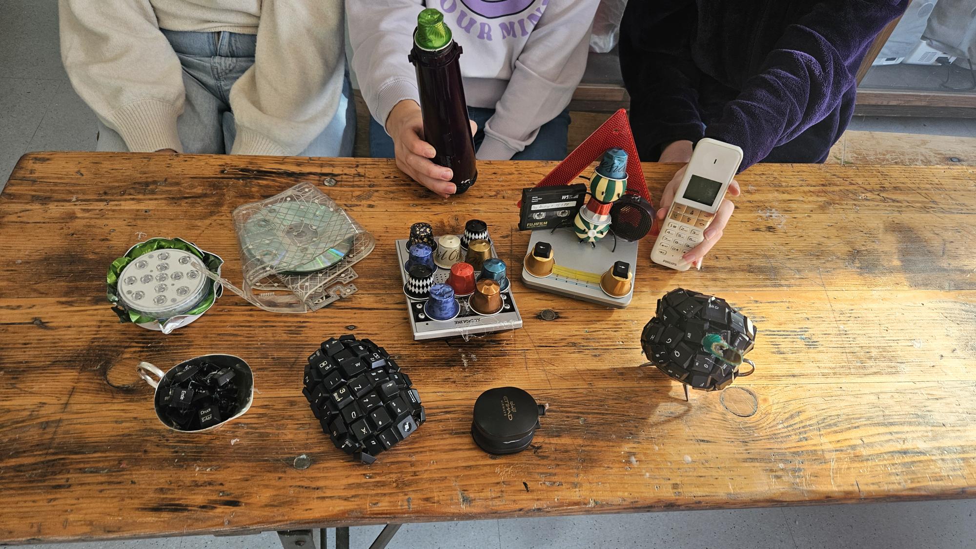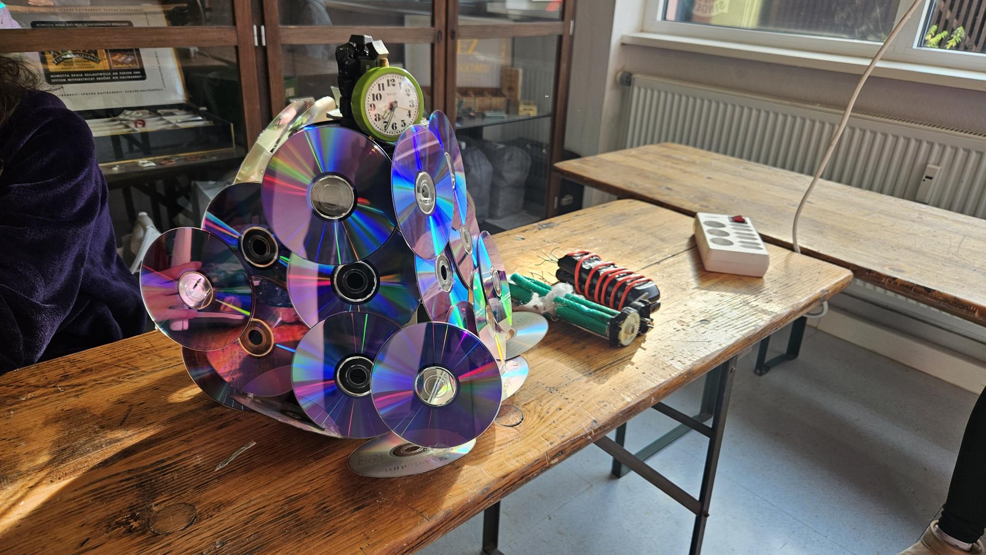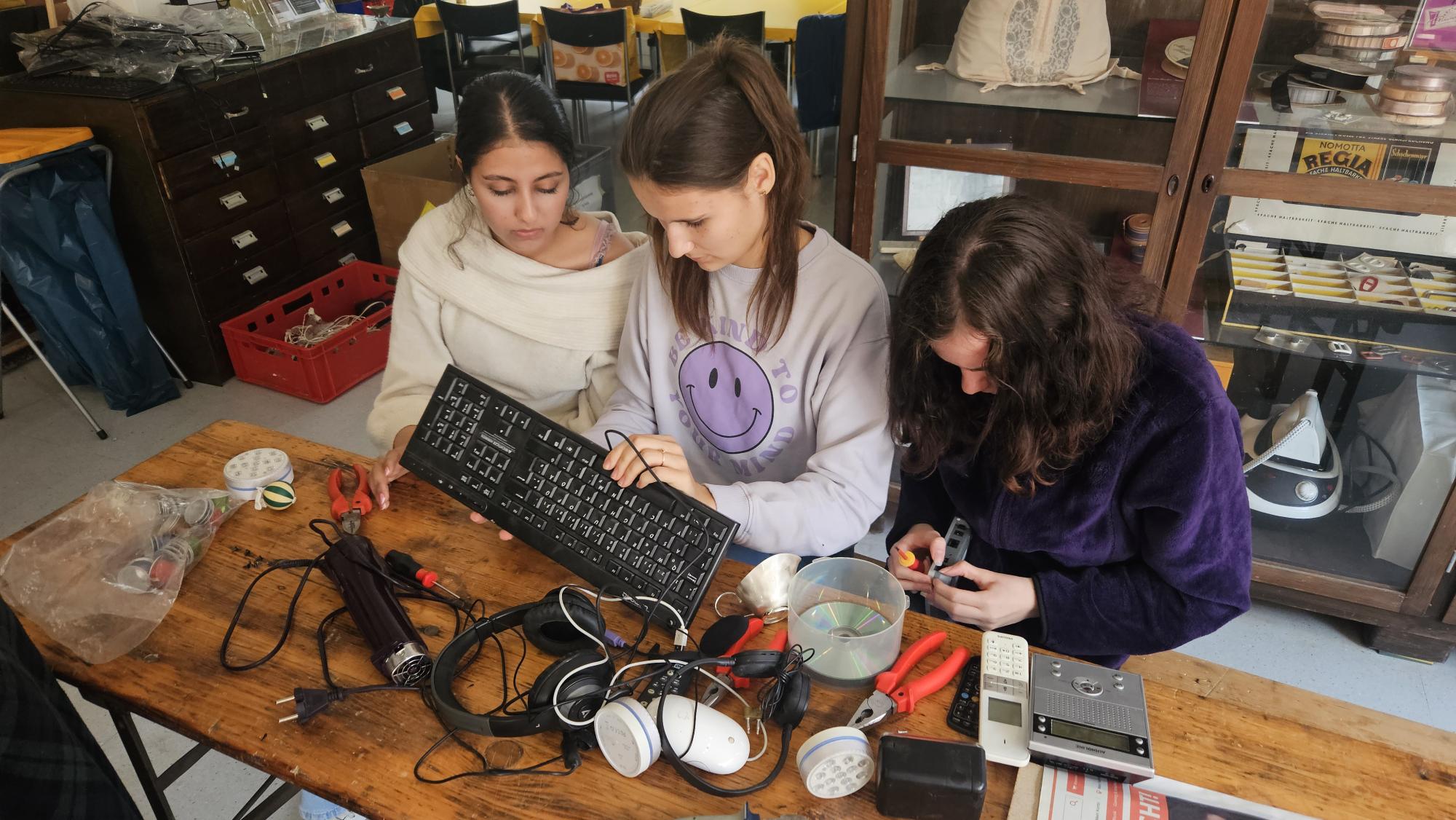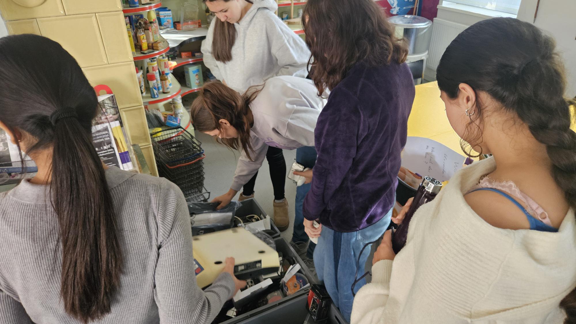 Der Museumsbesuch begann mit einer Führung durch die Ausstellung „klimagerecht leben“, die sich mit Fragen des Umweltschutzes und einer klimafreundlichen Lebensweise befasst. Die Schülerinnen und Schüler betrachteten dabei beeindruckende Fotografien, die auf globale Umweltprobleme aufmerksam machten. Anschließend wurden sie in Gruppen eingeteilt, um eine Fotografie auszuwählen und den dargestellten Umweltkonflikt sowie dessen Einfluss auf das menschliche Leben zu analysieren. In der anschließenden Präsentationsphase stellten die Gruppen ihre Ergebnisse vor. Antje Gräfe unterstützte sie dabei tatkräftig, indem sie auf einer Weltkarte zeigte, wo die jeweiligen Umweltprobleme auftreten, und mit der Klasse diskutierte, welche Auswirkungen diese auf unser tägliches Leben haben. Nach dem theoretischen Teil folgte der kreative Höhepunkt des Tages: der Workshop „Aus Elektroschrott Obst und Gemüse bauen“. Damit soll auf das Problem der Bedrohung durch Schadstoffe aufmerksam gemacht werden., die mit dem Müll in den Boden und so in Nahrungsmittel gelangen. Mit großer Begeisterung und Einfallsreichtum verwandelten die Schülerinnen und Schüler alte Tastaturen in Himbeeren und Brombeeren, Verpackungen in Weintrauben und Wassermelone und ausgediente CDs in eine riesige Orange. Die originellen Ergebnisse sorgten nicht nur für Staunen, sondern auch für viel Freude und Stolz bei allen Beteiligten.