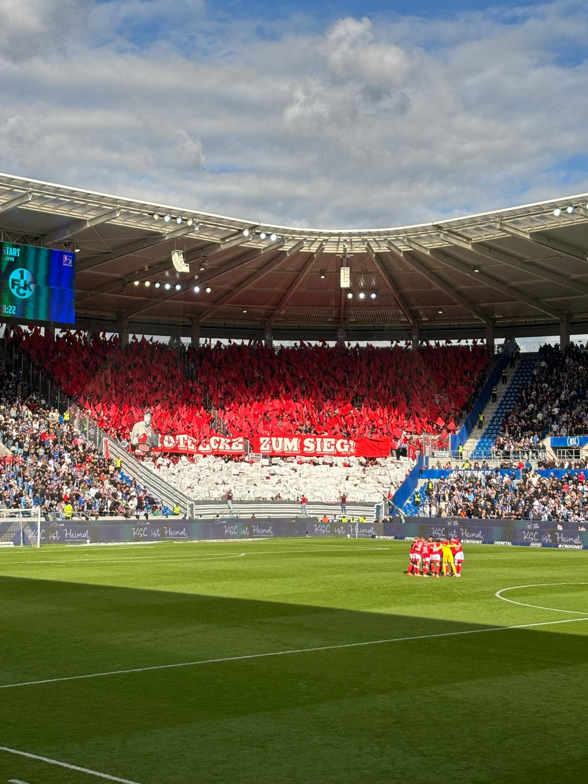 in der 54. Minute einleitete. Skyttäs Abschuss wurde von einem KSC-Spieler abgefälscht, der Ball senkte sich im hohen Bogen über Bernat ins Tor – großer Jubel im rot-weiß-roten Gästeblock. Doch die Badener gaben nicht auf – es folgte eine Drangphase und regelrechtes Powerplay der Gastgeber, welches in der 58. Minute durch den Anschlusstreffer von Schleusener belohnt wurde. In der 74. Minute rettete FCK-Defensivspieler Luca Sirch mit einer Monstergrätsche gegen Wanitzek, dessen Schuss die meisten Zuschauer wohl bereits im Tor sahen. Der verdiente Ausgleich fiel dann in der 83. Minute, als Egloff die Vorlage des eingewechselten und jungen KSC -Nachwuchsspielers Laghrissi verwertete. Das Momentum lag auf der Seite des KSC und die FCK-Mannschaft wäre wohl mit einem Punkt zufrieden gewesen. Aber Trainier Lieberknecht wechselte kurz vor dem Anpfiff Marlon Ritter ein und bewies einmal mehr ein glückliches Händchen. Nac Vorlage von Hanslik in der dritten Minute der Nachspielzeit vollendete er per Flachschuss aus 14 Metern einen Konter erfolgreich – und kurz darauf stand der Sieg der Leidenschaft, wie ihn im Nachgang Trainer Lieberknecht betitelte, fest.