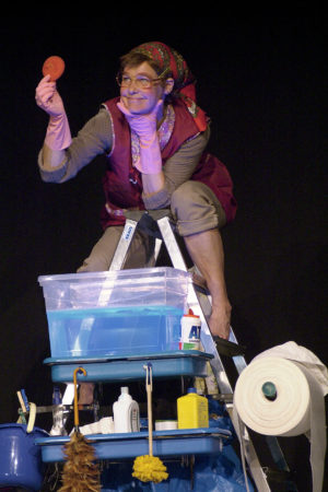 Da wird der Staubwedel zum eierlegenden Huhn und im Putzeimer planscht eine verliebte Seekuh. Der blaue Müllsack verwandelt sich in ein großmäuliges Monster und dem mächtigen Meer aus Seifenschaum entsteigt eine weitere skurrile Idee.