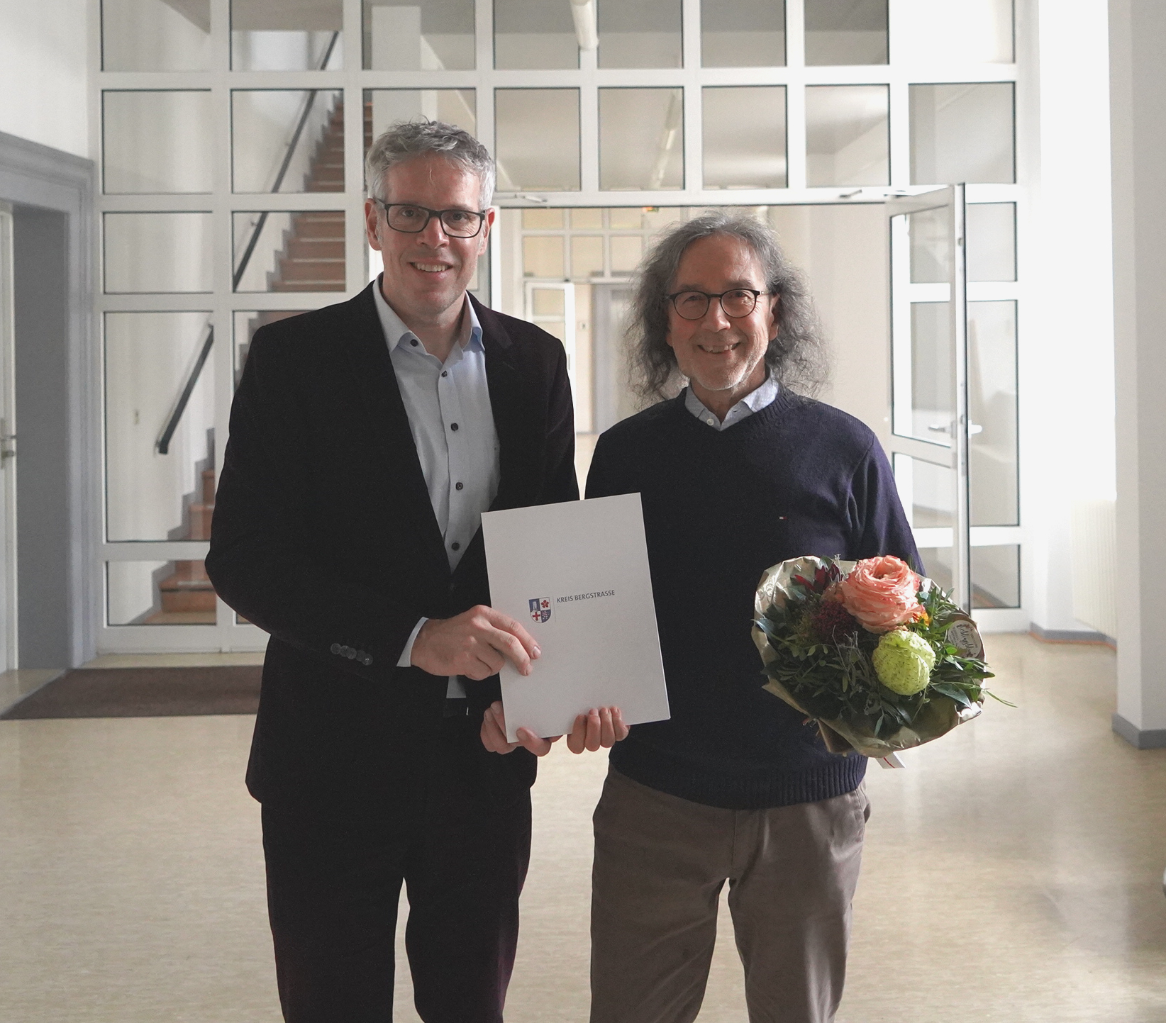 Kreis Bergstraße (kb)-Es war ein Abschied, der beiden Seiten schwerfiel. Rainer Schmitt, Sozialarbeiter im Fachbereich Migration und Integration des Jugendamtes, könnte eigentlich schon seit dem 01.01.2023 im wohlverdienten Ruhestand sein. Doch aufgrund steigender Fallzahlen im Bereich unbegleitete minderjährige Flüchtlinge im Jugendamt und des Fachkräftemangels im Sozialwesen hatte Rainer Schmitt über seinen Renteneintritt hinaus seine Unterstützung angeboten. Dieses außergewöhnliche Engagement für die Kreisverwaltung würdigte Landrat Christian Engelhardt jetzt bei Schmitts Verabschiedung im Landratsamt: „Sie haben in Ihrem Leben schon einiges gemacht und haben dann die Aufgabe gefunden, die Sie erfüllt. Als Sozialarbeiter haben Sie Ihre Berufung gefunden. Herzlichen Dank für Ihren außergewöhnlichen Einsatz für den Kreis Bergstraße, auch über den Renteneintritt hinaus. Dieses Engagement ist alles andere als selbstverständlich.“