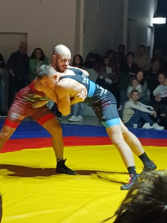 Dann folgte einer der ausgeglichensten Kämpfe des Abends: Cedric Kriz (75A kg GR) gegen Colin Eckert. Beide schenkten sich nichts, es war ein enger Kampf, bei dem Cedric aber der aktiver Sportler war. Cedric blieb taktisch klug und sicherte sich schließlich einen 5:7-Punktsieg – ein Beispiel für die vielen engen Momente, die im Endergebnis kaum sichtbar werden.