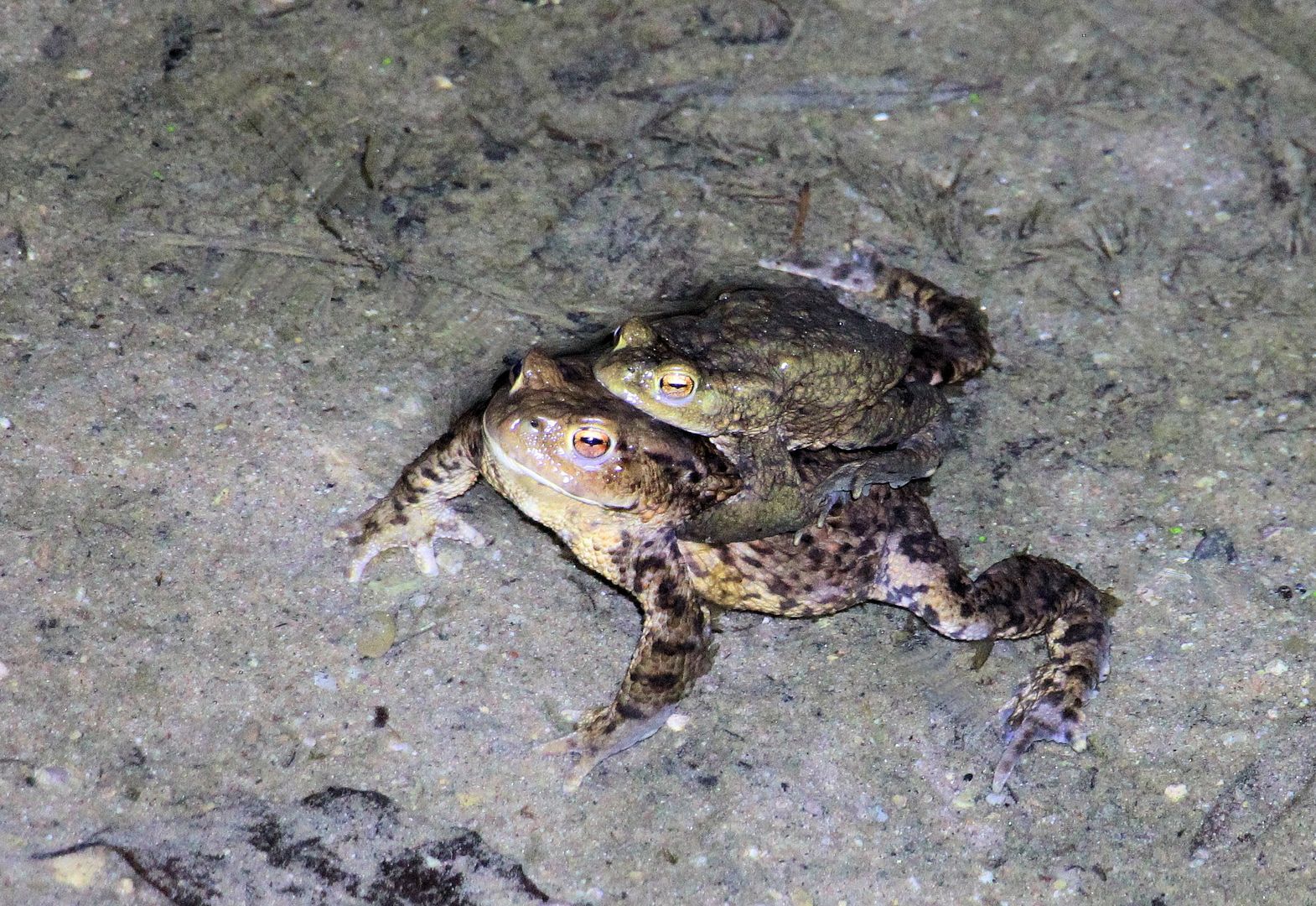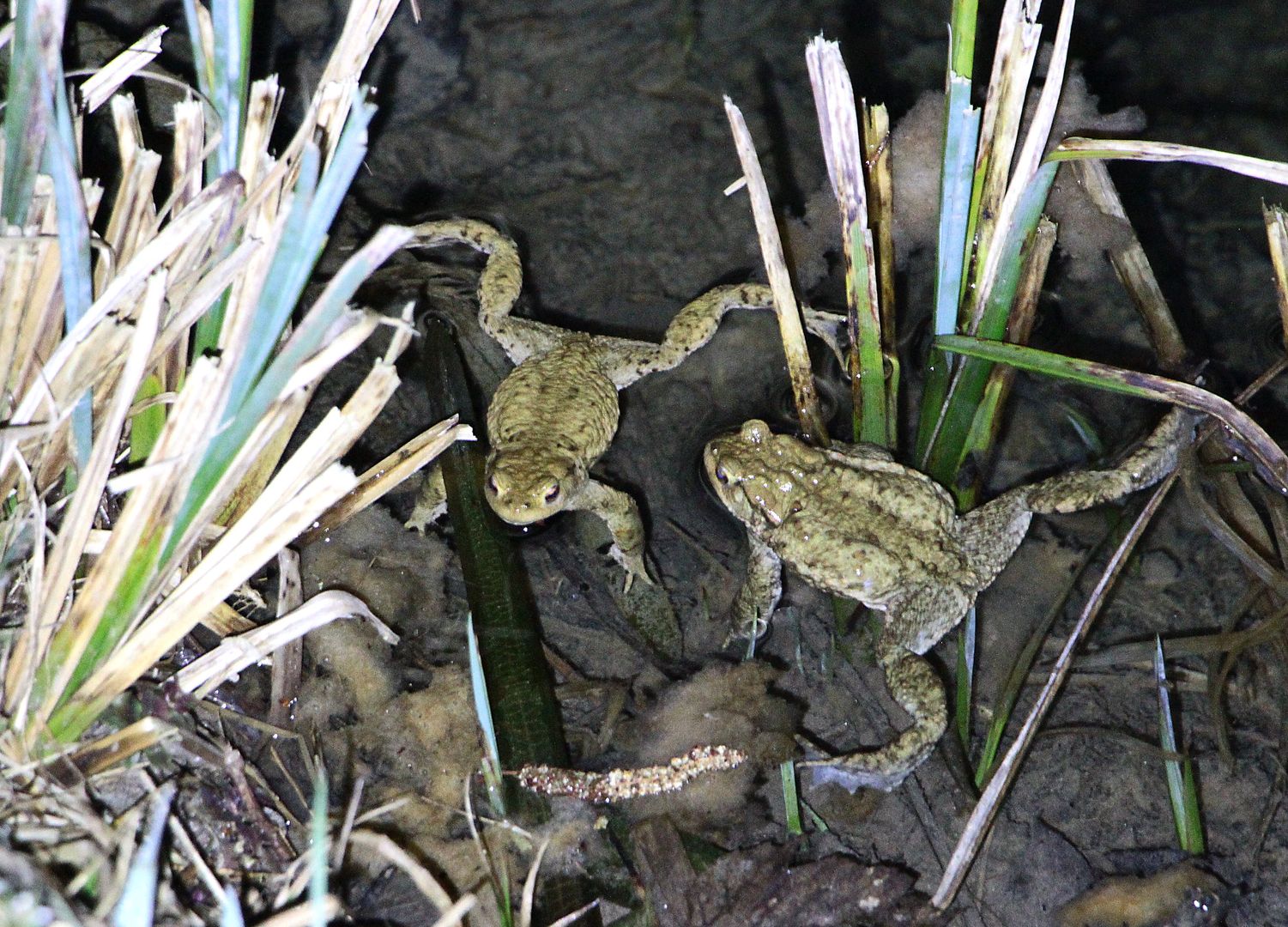Und dann war es soweit, im Licht des Mondes zeigten sich die ersten Kröten, unter ihnen auch viele sogenannte Doppeldecker, und spähende Männchen, die geduldig auf den Wegen saßen, um nach anwandernden Weibchen Ausschau zu halte.