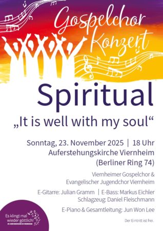 Bei diesem ersten gemeinsamen Projekt treten der Viernheimer Gospelchor und der Evangelische Jugendchor gemeinsam auf. Das Konzert steht unter dem Thema „Spiritual“ und trägt den hoffnungsvollen Untertitel „It is well with my soul“. Begleitet werden die Chöre von den erfahrenen Instrumentalisten Julian Gramm an der E-Gitarre, Markus Eichler am E-Bass und Daniel Fleischmann am Schlagzeug. Die Gesamtleitung am E-Piano hat Kantor Jun Won Lee.