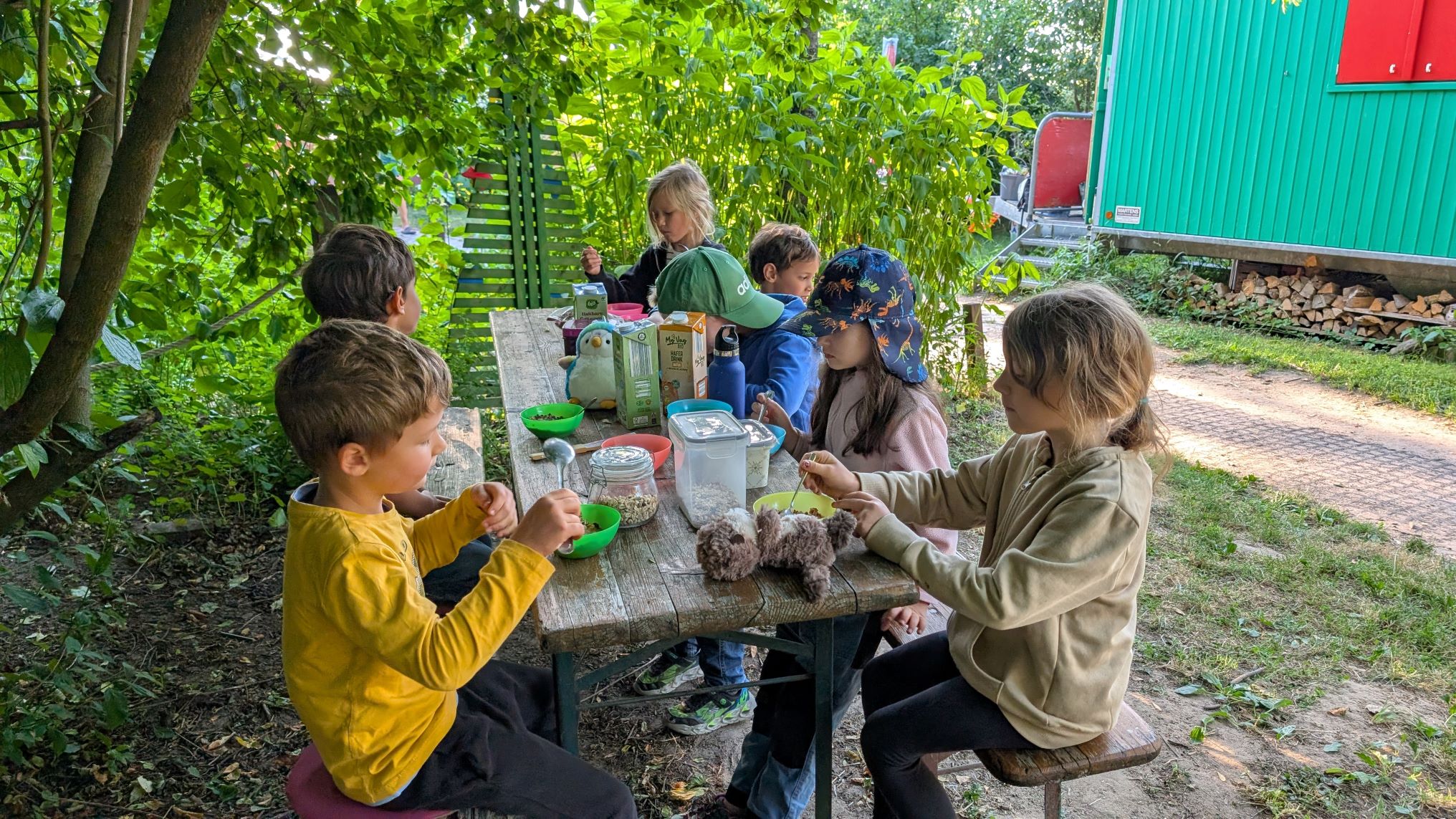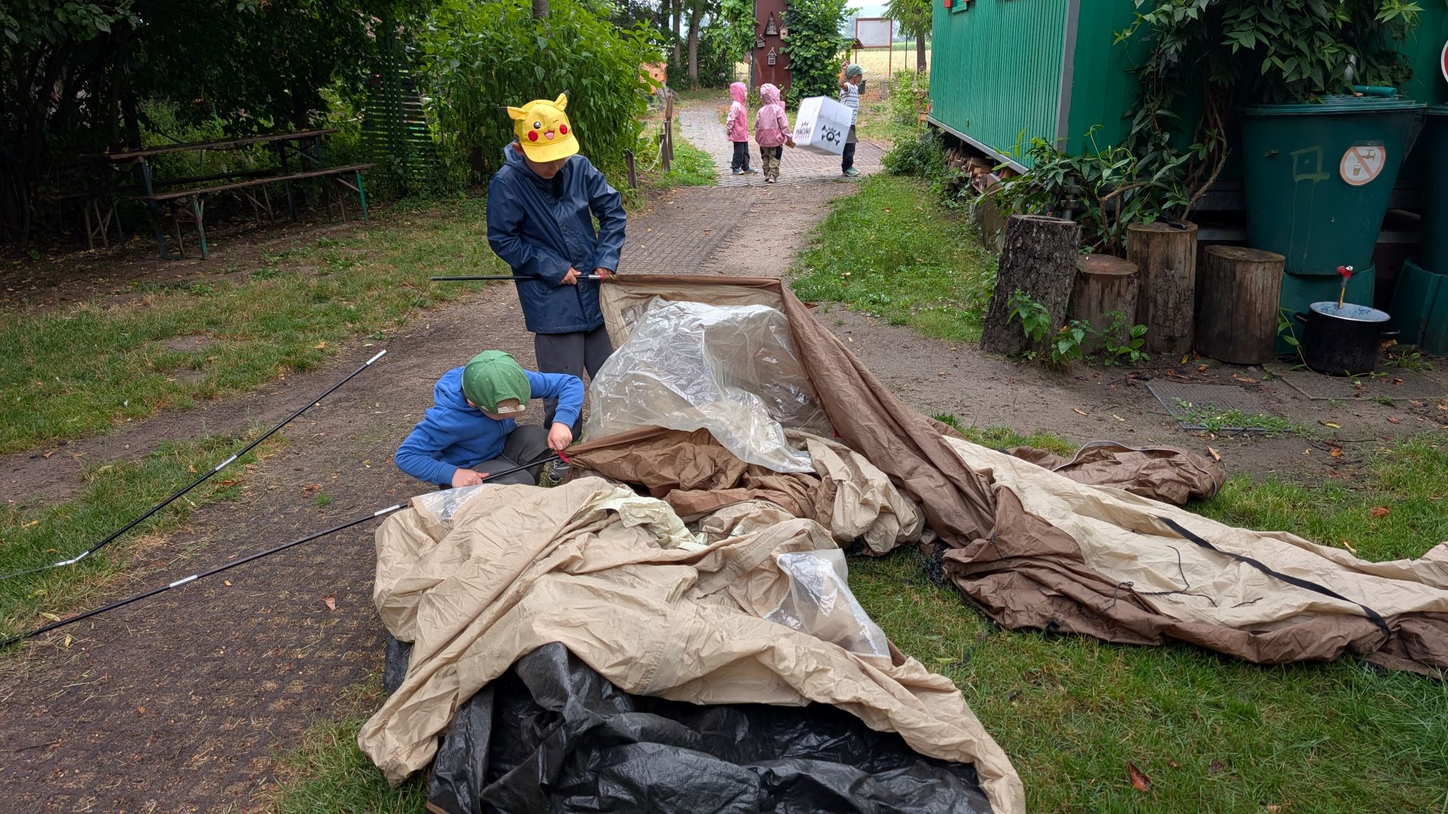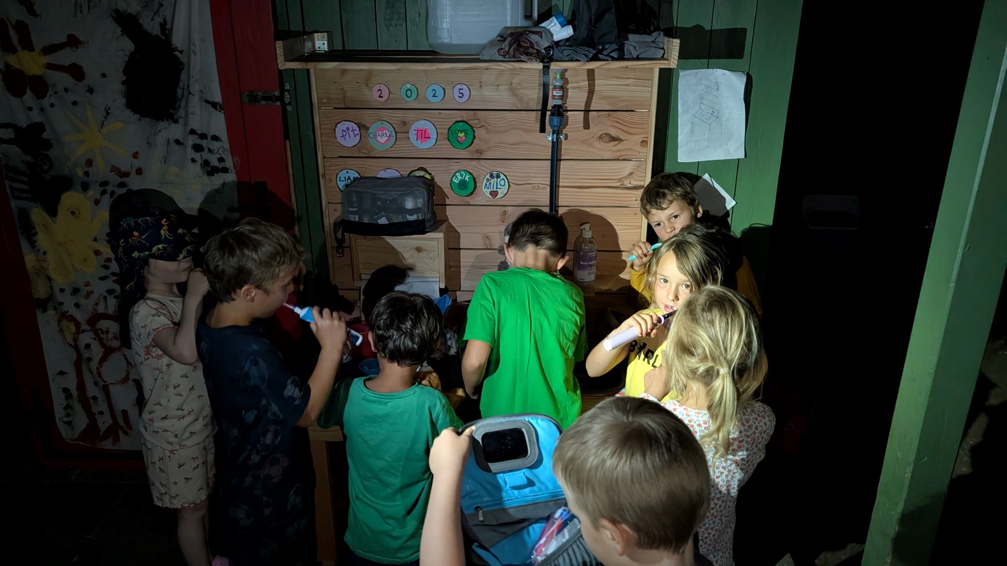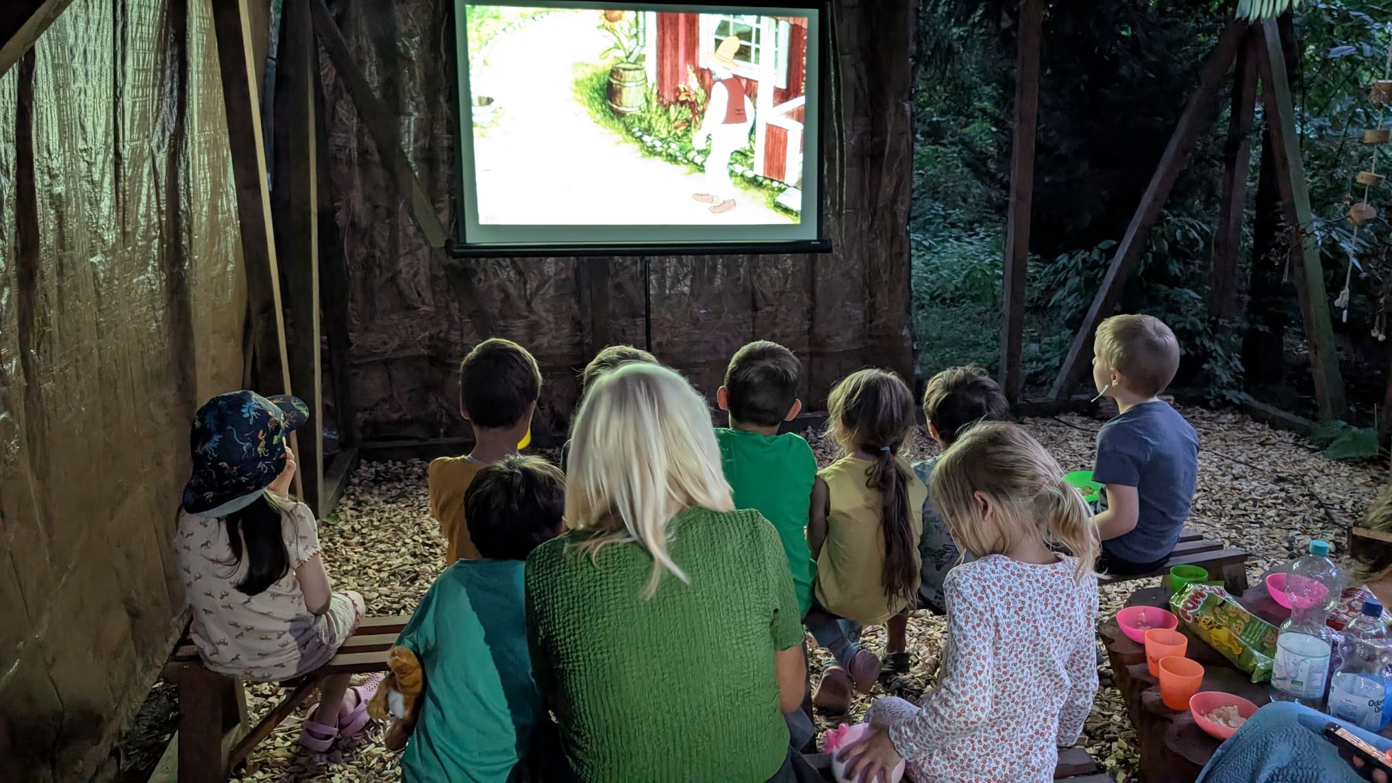Zurück auf dem Grundstück hieß es Schlafsachen anziehen und dann ging es ins Kino. Unter dem Carport hatten die Erzieher+innen die Leinwand aufgebaut auf der sie „Petterson und Findus“ schauten. Um 23 Uhr hieß es dann Zähne putzen und Ab ins Bett.