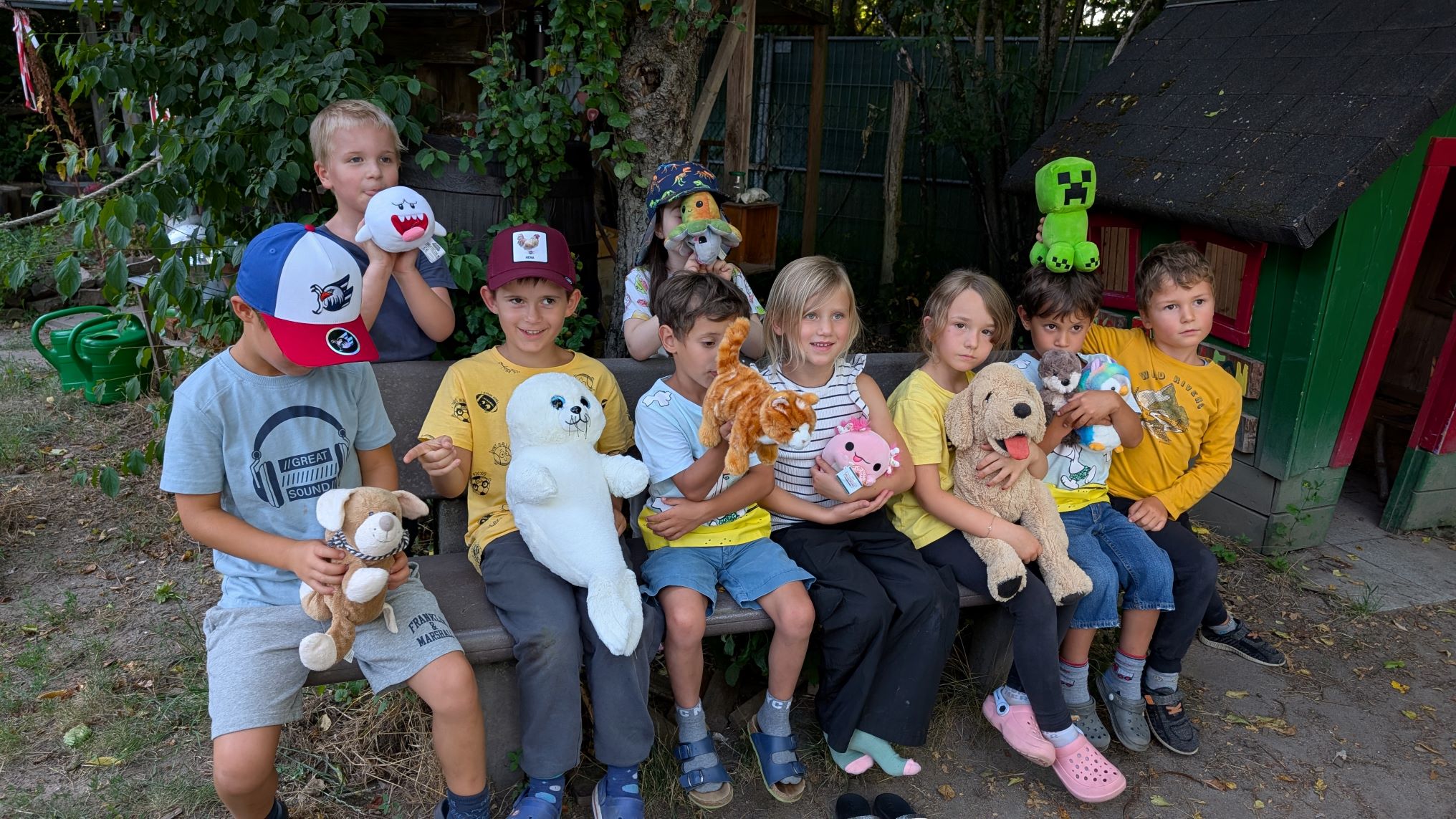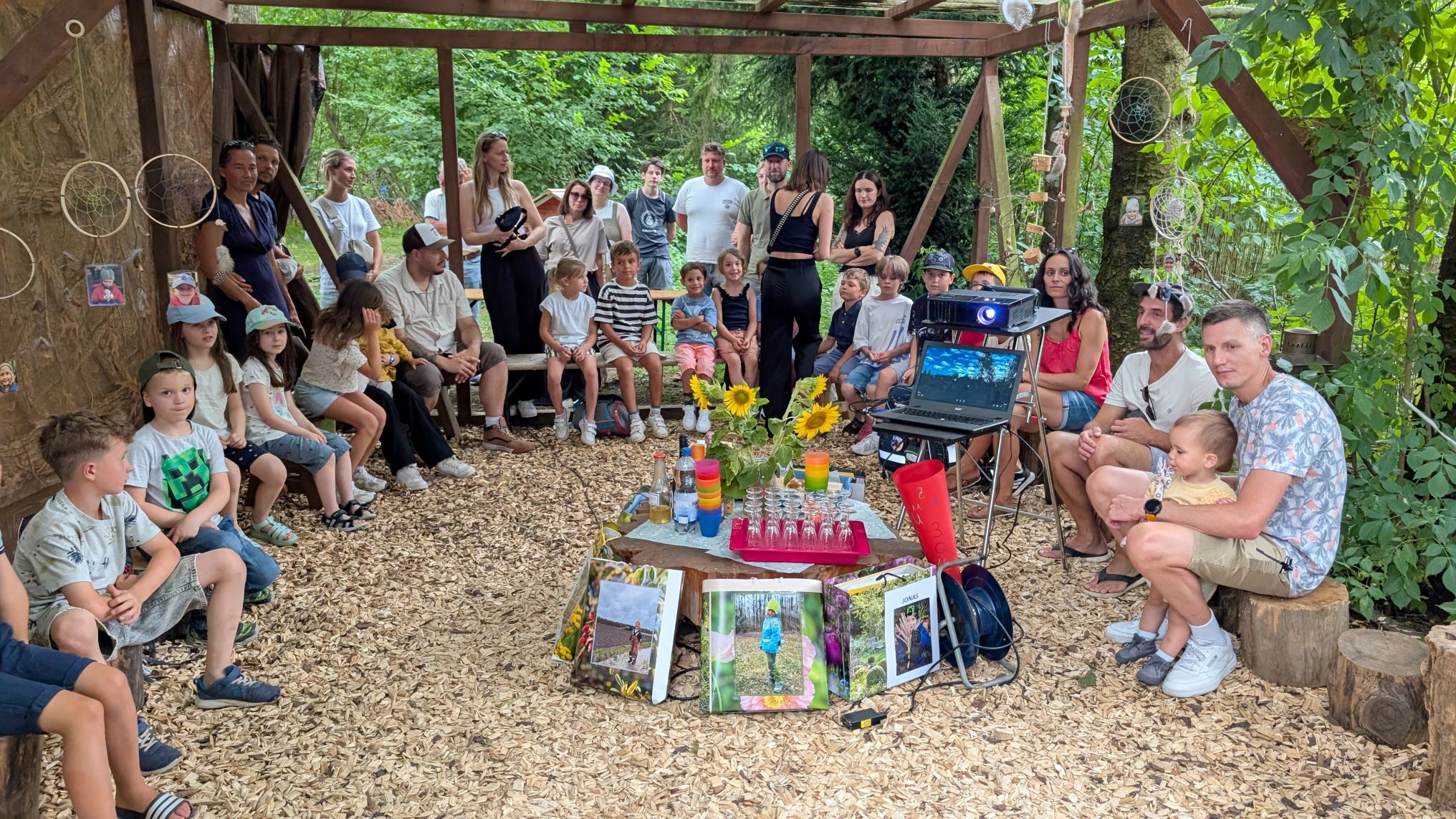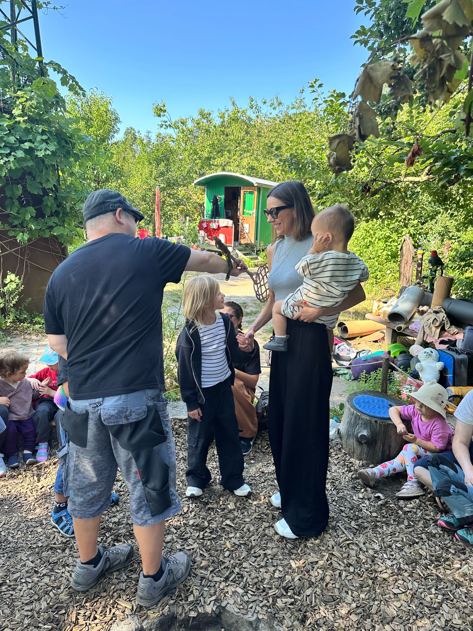 Für die Abschiedsfeier mit den Familien hatten die Hasenkinder schon Wochen vorher das Gedicht „Bald sind wir ein Schulkind“ gelernt und dann den Eltern vorgetragen. Danach sangen die Erzieher*innen den Kindern das Lied „Wir sagen euch Tschüss!“. Dazu waren auf einer Leinwand Bilder von den Kindern aus ihrer Waldzeit zu sehen und so manche Träne wurde vergossen.