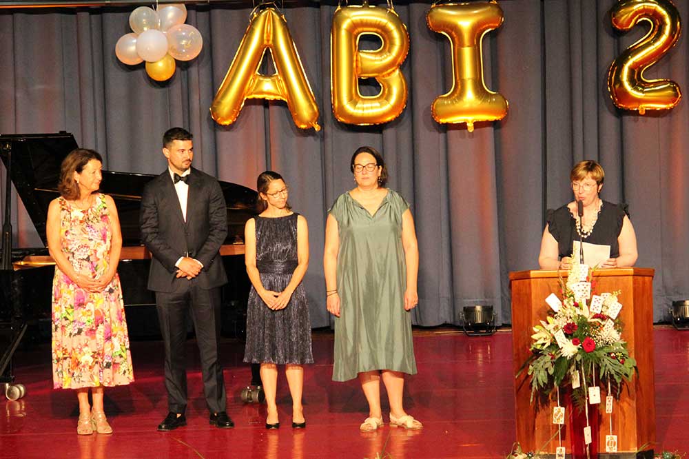 Im Anschluss sorgte auch auf der Abiturfeier die Hip-Hop-AG von Frau Volz mit ihrem Auftritt für beste Stimmung. Nachdem die Tutorinnen Frau Dr. Thomoglou und Frau Weber sowie der Tutor Herr Andres ihre Glückwünsche und guten Wünsche für die Zukunft und das „bevorstehende Abenteuer“ übermittelt hatten, richteten schließlich Herr Dr. Hunger und Frau Hördt als Vertreter bzw. Vertreterin der Elternschaft das Wort an die Gäste.