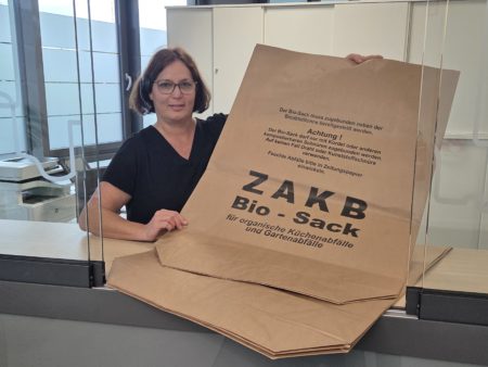 Die Abfallsäcke sind mit einem Schriftzug der ZAKB versehen und werden im Rahmen der turnusmäßigen Biotonnenleerung durch das Abfallunternehmen mit entsorgt.