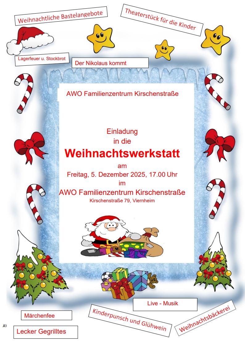 Herzliche Einladung zur Weihnachtswerkstatt am Freitag, den 5. Dezember VO 25. November 2025 Herzliche Einladung zur Weihnachtswerkstatt am Freitag, den 5. Dezember2025-11-25T13:17:24+00:00 ViernheimDas AWO-familienzentrum Kirschenstraße lädt am 5. Dezember 2025 ab 17.00 Uhr zur Weihnachtswerkstatt ein.Foto: AWODas könnte Sie auch interessierenStadtwerke Viernheim: Warnung vor unerwünschten Anrufen Musikschule Viernheim: Auswahlkonzert für Leistungsstipendium – Bühne frei für junge TalenteKatholische Kirche Viernheim lädt ein: Immersive Video-Artshow „Infinity“ in Heidelberger Heiliggeistkirche