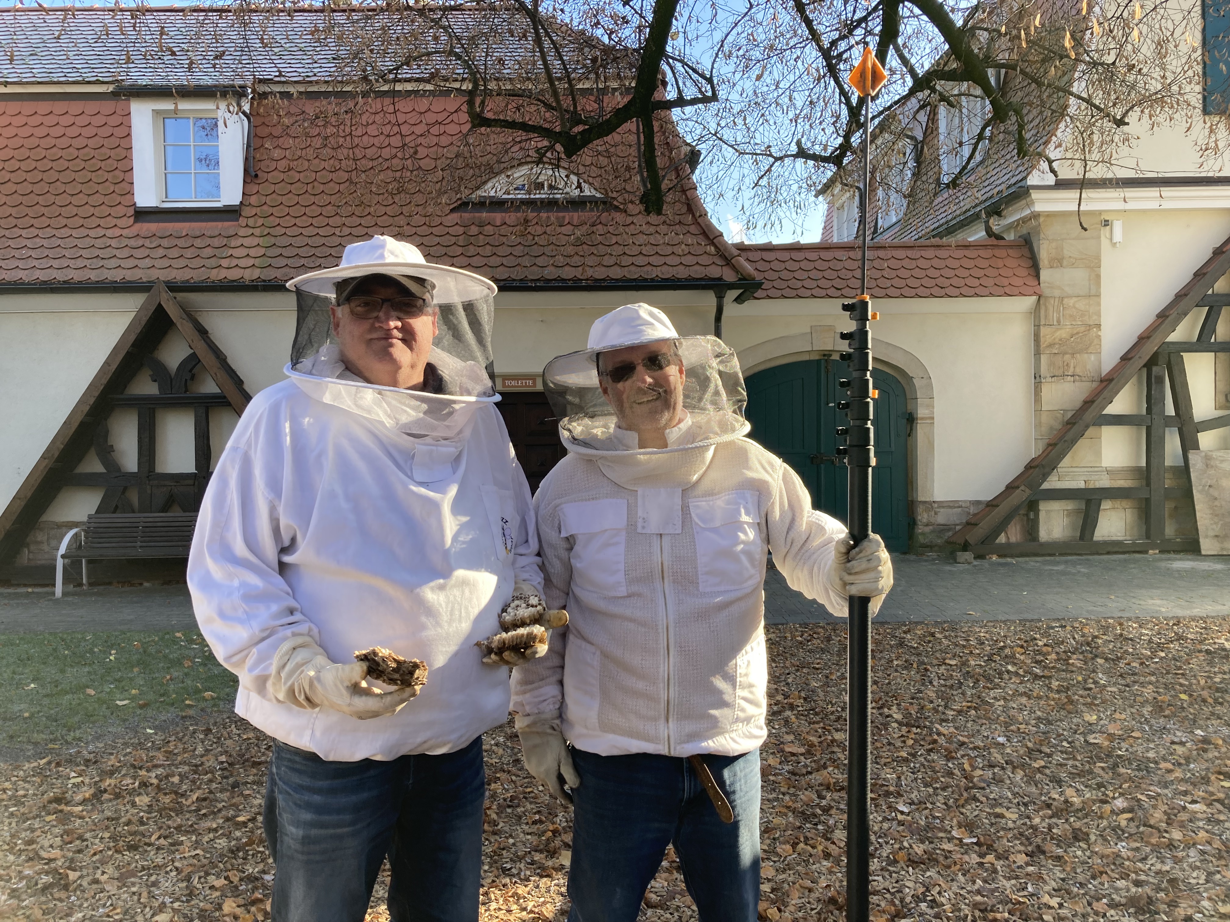 „Achtung, die kommen runter“, ruft Hans Bugert. Obwohl er einen Schutzanzug trägt, zieht er den Kopf ein. Asiatische Hornissen rieseln herab – aus einem Nest in 20 Meter Höhe in der alten Linde im Garten des Museums. Aber Hornissenberater Bugert und Imker Michael Falkenstein, der mit einer Lanze das Nest zerstückelt, haben Glück. Weil das Thermometer null Grad anzeigt, sind die Hornissen starr vor Kälte und können nicht angreifen. Trotzdem gehen die beiden auf Nummer sicher: Sie sichern ihre Arbeitsstelle weiträumig ab. Denn sie wissen: Die asiatische Hornisse ist nicht zu unterschätzen.