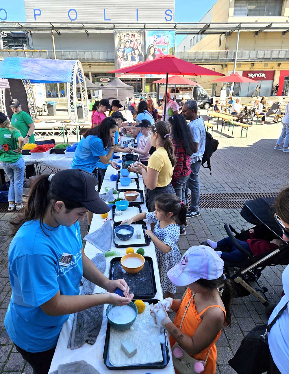 Ein besonderer Höhepunkt war die große Filzaktion der Jugendwerkstatt zum Freiwilligentag am Rhein-Neckar-Zentrum. Dort filzten aus- und weitergebildete Jugendleiter gemeinsam mit rund 150 Kindern Jonglierbälle aus Schafwolle, Wasser und Seife – ein Erlebnis, das bei vielen lange in Erinnerung bleiben dürfte.