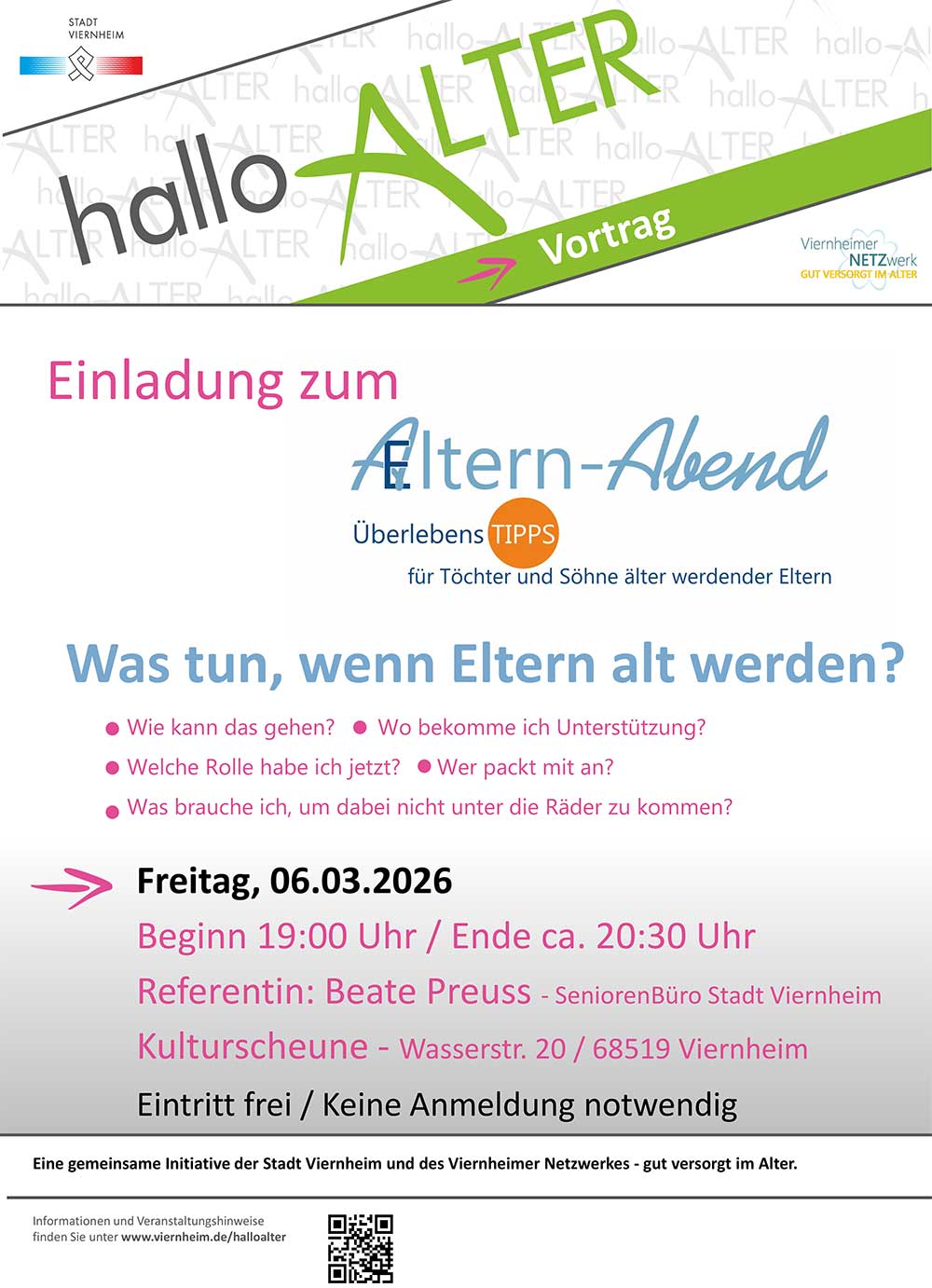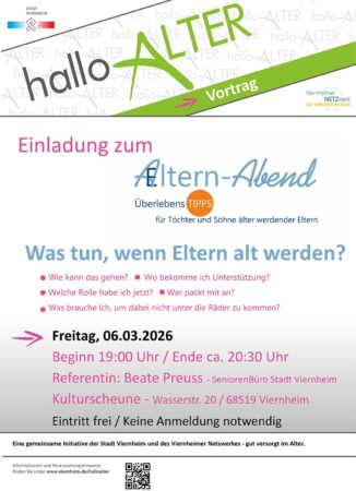 Mit dem AeLTERN-Abend am Freitag, 6. März 2026, um 19 Uhr in der KulturScheune Viernheim, Wasserstraße 20, laden das städtische SeniorenBüro und das „Viernheimer Netzwerk – gut versorgt im Alter“ zu einem ebenso informativen wie persönlichen Vortrag ein. Unter dem Titel „Was tun, wenn Eltern alt werden?“ zeigt Beate Preuss vom städtischen SeniorenBüro Wege auf, wie erwachsene Kinder mit den vielfältigen Anforderungen umgehen und gleichzeitig gut für sich selbst sorgen können.