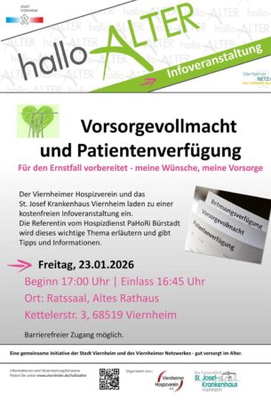 Viernheim (Stadt Viernheim) – Am Freitag, 23. Januar 2026, um 17 Uhr, findet im Ratssaal des Alten Rathauses, Kettelerstraße 3, ein kostenloser Vortrag zum Thema Vorsorgevollmacht und Patientenverfügung statt. Veranstaltet wird der Informationsabend im Rahmen der städtischen Kampagne „halloAlter“ vom Viernheimer Hospizverein e.V. in Kooperation mit dem St. Josef Krankenhaus unterstützt durch das städtische SeniorenBüro. Einlass ist ab 16:45 Uhr, der Zugang ist barrierefrei. Eine Anmeldung ist nicht erforderlich.