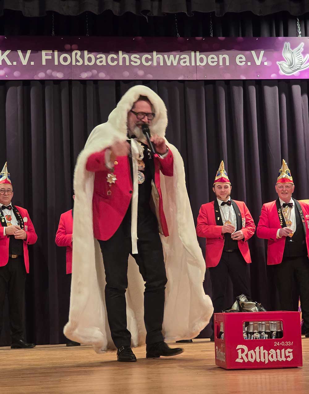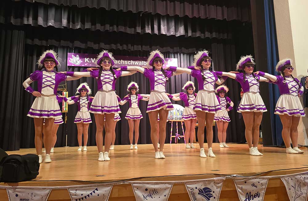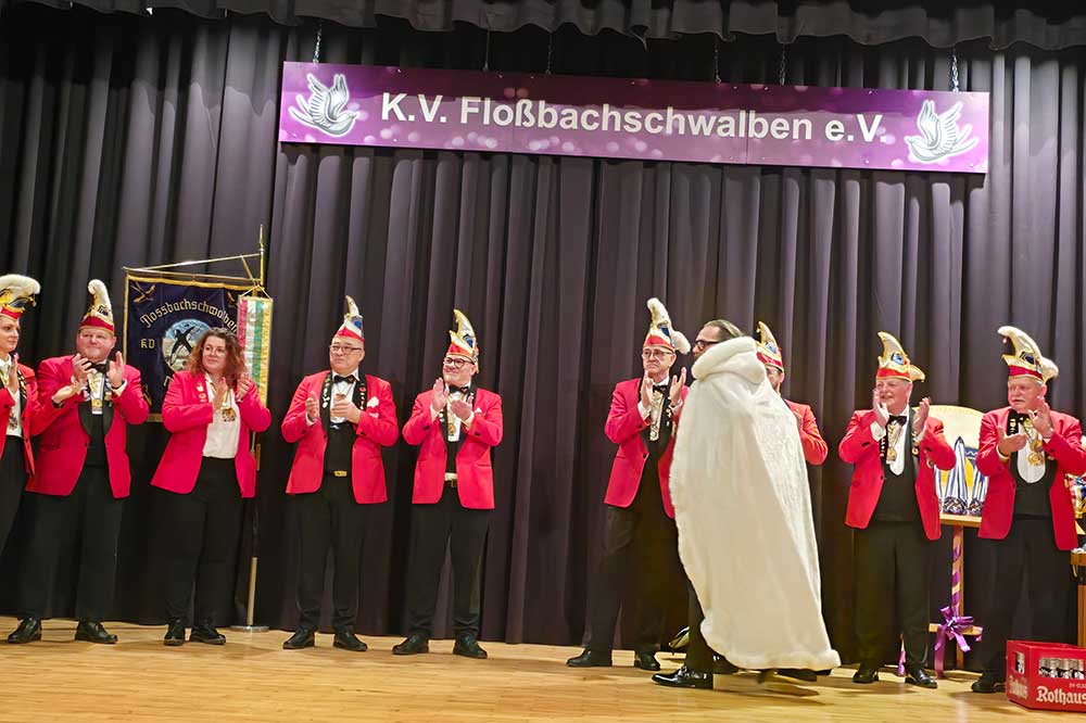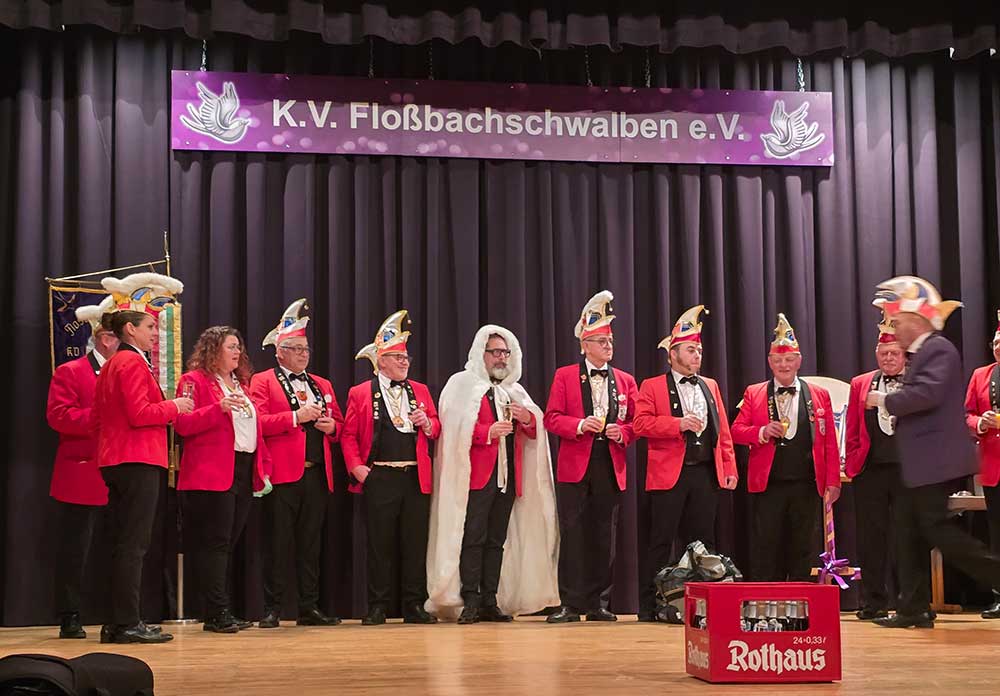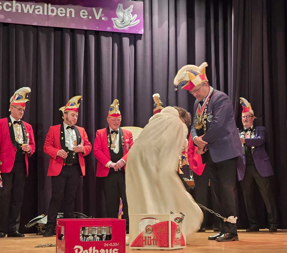 Beim Karnevalverein Floßbachschwalben Maxdorf wurde den Gästen aus Nah und Fern ein abwechslungsreiches Programm geboten, die Garden begeisterten mit ihren Garde-und Showtänzen und ernteten riesigen Applaus, auch die humorvollen Beiträge in der Bütt sorgten für beste Stimmung im Saal. Aus dem Nachbardorf Birkenheide kam der Karnevalclub die Kraniche zu Besuch, sie hatten sich eine lustige „Bühneneinlage“ ausgedacht, der Hintergrund war eine Geschichte aus der letzten Kampagne,, wobei es unter anderem um einen Kasten Bier ging. So wurde  Sitzungspräsident Uwe Mattheis an einem Bierkasten mit einer Kette gefesselt, dies sorgte natürlich für große Belustigung beim Publikum.