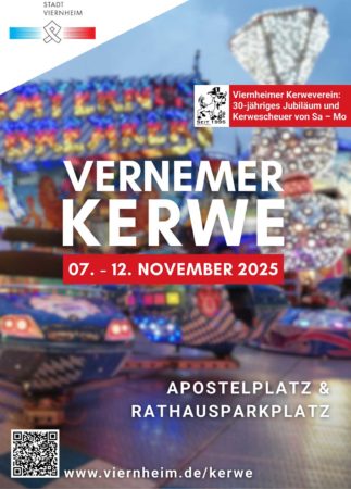 Viernheim (Stadt Viernheim) – Die Stadt Viernheim lädt auch in diesem Jahr gemeinsam mit dem Kerweverein e.V. und zahlreichen Schaustellern zur Vernemer Kerwe ein. Vom 7. bis 12. November 2025 verwandeln sich der Apostelplatz und der Rathausparkplatz in ein buntes Festgelände für Groß und Klein. Besucherinnen und Besucher können sich auf abwechslungsreiche Fahrgeschäfte, kulinarische Spezialitäten und ein vielfältiges Programm freuen. „Die Viernheimer Kerwe ist ein fester Bestandteil unseres städtischen Lebens und ein Highlight im Veranstaltungskalender. Sie bringt Menschen zusammen, verbindet Tradition mit Geselligkeit und bietet Jung und Alt ein besonderes Erlebnis mitten in Viernheim“, so Bürgermeister Matthias Baaß bei der Vorstellung des diesjährigen Programms.