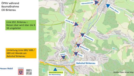 Betroffen sind die Buslinien 680, 688, 689 und 692. Dabei entfallen in Birkenau die Haltestellen „Schloss“, „Brücke“, „Rathaus/EKZ“, „Schwimmbad“, „Auf der Aue“ und in Reisen die Haltestelle „Odenwaldstraße“.
