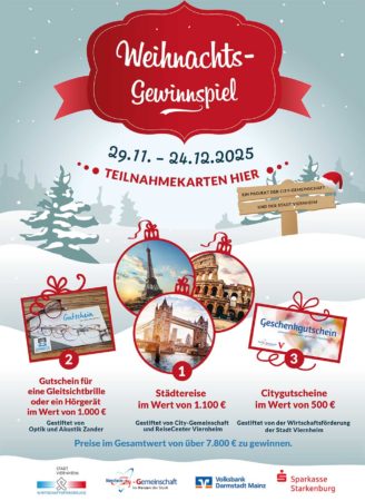 Es ist das 16. Weihnachtsgewinnspiel, auf das sich die Kunden der Viernheimer Innenstadtgeschäfte freuen können. Durchgeführt wird es von der City-Gemeinschaft Viernheim und der städtischen Wirtschaftsförderung mit freundlicher Unterstützung der Volksbank Darmstadt Mainz eG und der Sparkasse Starkenburg. „Das Gewinnspiel erfreut sich Jahr für Jahr großer Beliebtheit“, berichtet Alexandra Thomas vom Vorstand der City-Gemeinschaft Viernheim und verspricht für 2025: „Es winken wirklich hochwertige Gewinne.“ Allein die drei ersten Preise haben einen Gesamtwert von 2.600 Euro. Als Hauptgewinn haben die City-Gemeinschaft und das ReiseCenter Viernheim einen Reisegutschein im Wert von 1.100 Euro für eine Städtereise ausgelobt. Der zweite Gewinner kann sich über eine Gleitsichtbrille oder ein Hörgerät im Wert von 1.000 Euro freuen, den Optik und Akustik Zander gesponsert hat. Die städtische Wirtschaftsförderung stellt als dritten Preis City-Gutscheine in einem Wert von 500 Euro zur Verfügung.