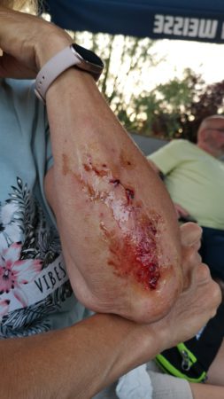 Ein Foto der Abschürfungen an meinem Unterarm liegt bei. Die Prellungen und kleine Abschürfung am Bein habe ich nicht fotografiert. Ich fahre immer sehr vorsichtig; dieser Sturz wäre vollkommen unnötig gewesen.