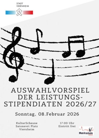 Viernheim (Stadt Viernheim) – Die städtische Musikschule lädt am kommenden Sonntag, 8. Februar, um 17 Uhr (Einlass ab 16:45 Uhr) herzlich zu einem besonderen Konzert in die Kulturscheune am Satonévri-Platz 1 ein. Dort zeigen die möglichen neuen Leistungsstipendiatinnen und -stipendiaten der Musikschule, was in ihnen steckt. Der Eintritt ist frei – Musikbegeisterte jeden Alters sind willkommen!