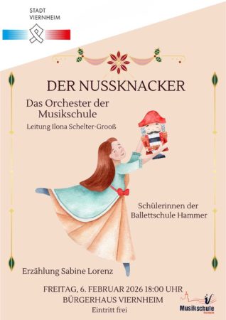 Viernheim (Stadt Viernheim) – Das Orchester der städtischen Musikschule lädt zu einem besonderen Konzerterlebnis ein: Am Freitag, 6. Februar 2026, um 18 Uhr (Einlass ab 17:30 Uhr) erklingt im Großen Saal des Bürgerhauses, Kreuzstraße 2 – 4, Peter I. Tschaikowskys weltberühmtes Ballett „Der Nussknacker“ in einer lebendigen Inszenierung, die Musik, Erzählung und Tanz zu einem eindrucksvollen Gesamterlebnis verbindet.