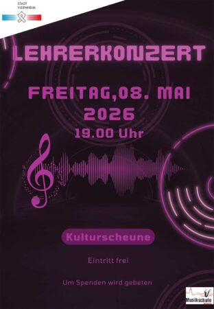 Viernheim (Stadt Viernheim) Ein kurzweiliger musikalischer Abend erwartet die Besucherinnen und Besucher beim Lehrerkonzert der städtischen Musikschule am Freitag, dem 8. Mai 2026 um 19 Uhr (Einlass ab 18:30 Uhr) in der Kulturscheune am Satonévri-Platz 1.