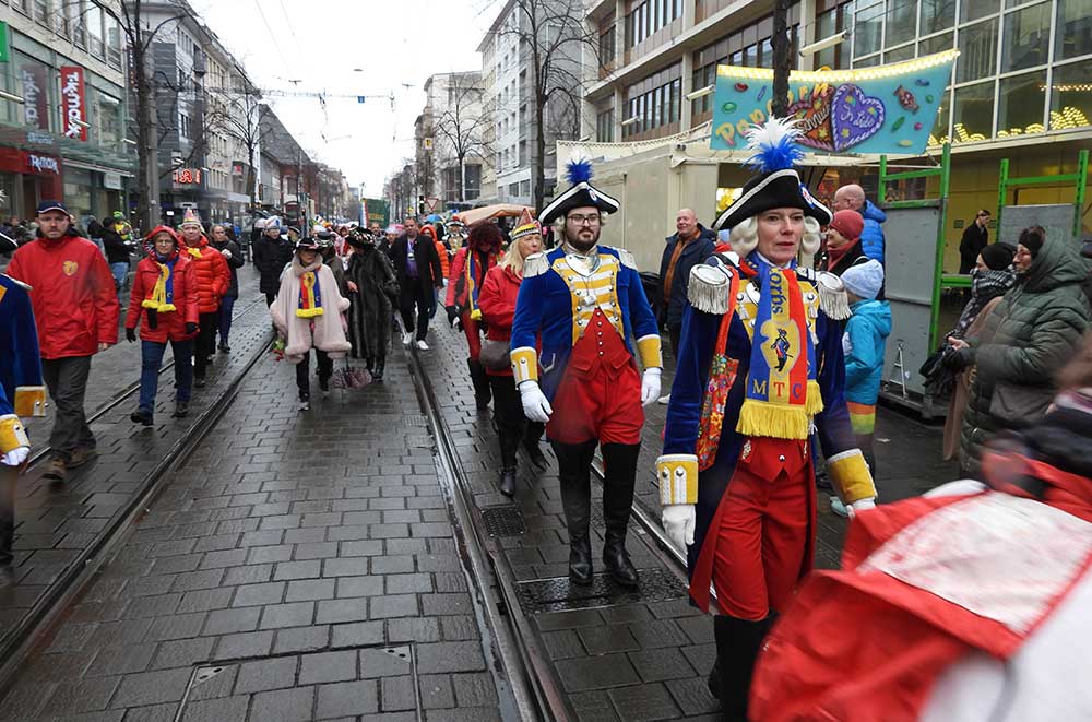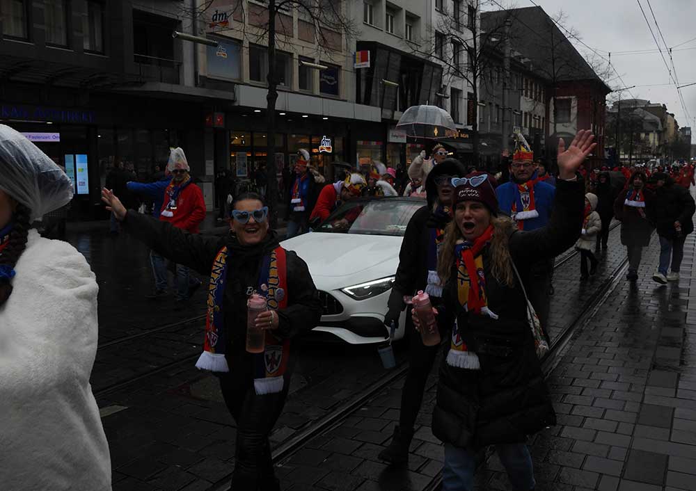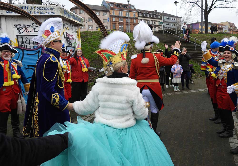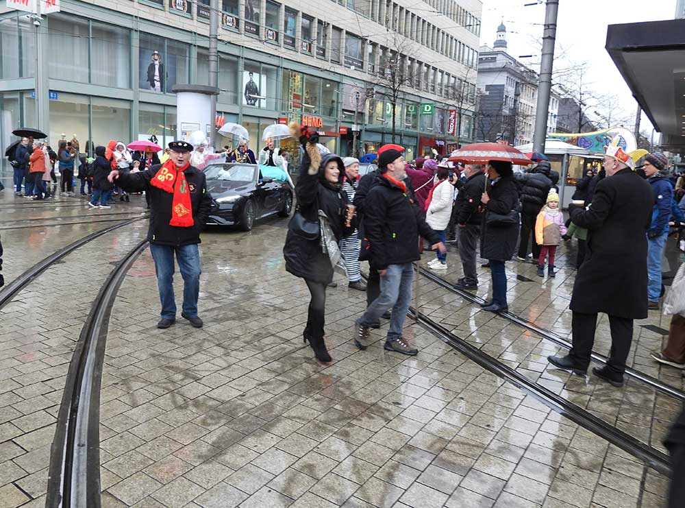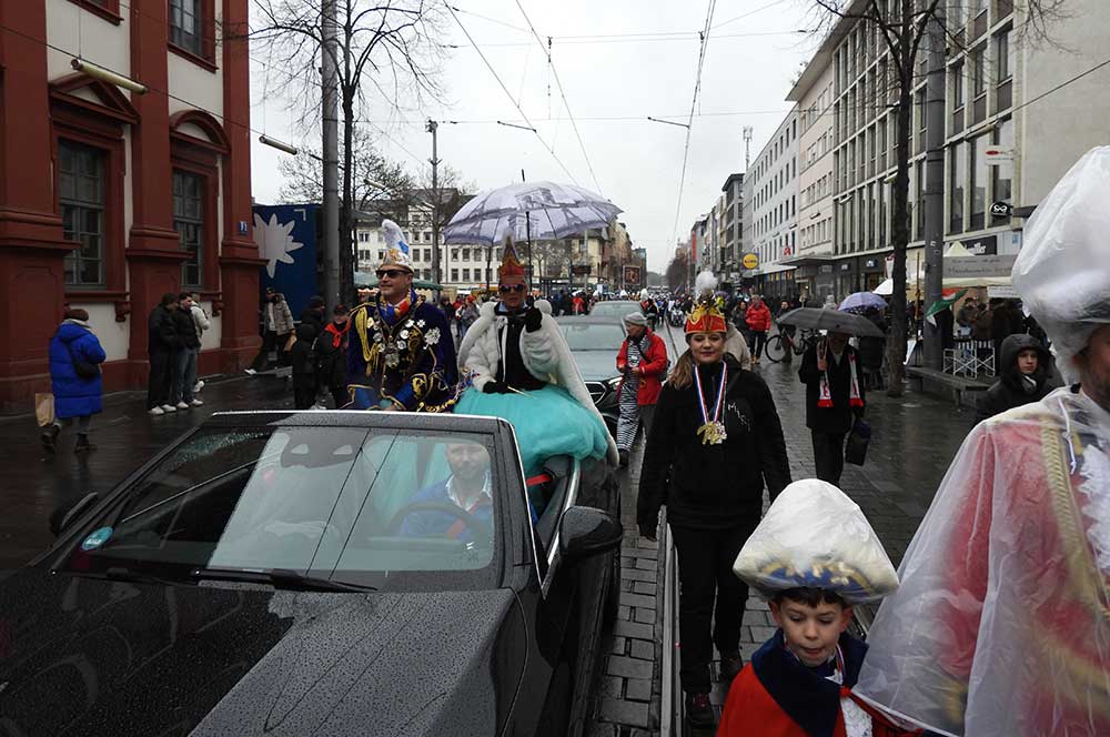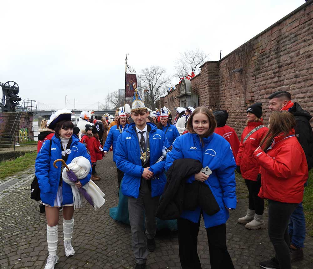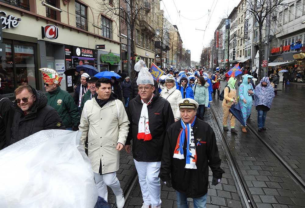 Gegen 11.30 Uhr gingen alle gut gelaunt von Bord mit AHOI , Musik und guter Laune wurden alle von den Elferräten, Garden, Senatoren und den Vereinsmitgliedern in Empfang genommen, gemeinsam ging es zum tradtionellen „ kleinen Umzug“. Zahlreiche Prinzessinen, die Elferräte, Garden und weitere Narren waren am „Start“, trotz Regen. Von der Kurpfalzbrücke bis zum Wasserturm liefen die Narren, auch der Regen konnte der guten Laune nichts anhaben. Leider standen nicht soviele Fastnachter am Straßenrand, dafür hatten die einkaufen waren, ihren Spaß vorallem die Kinder.