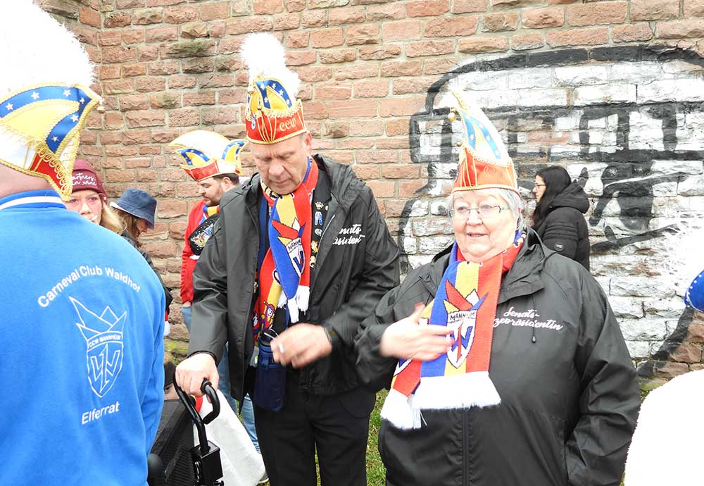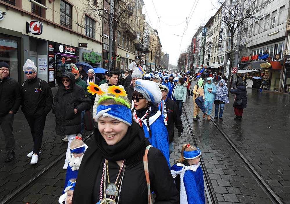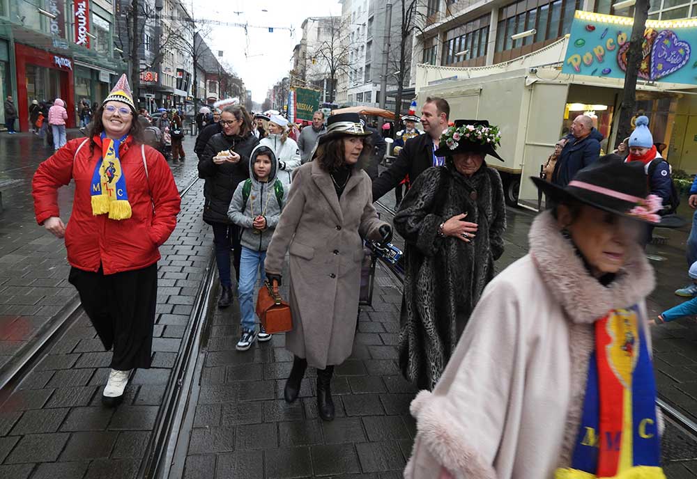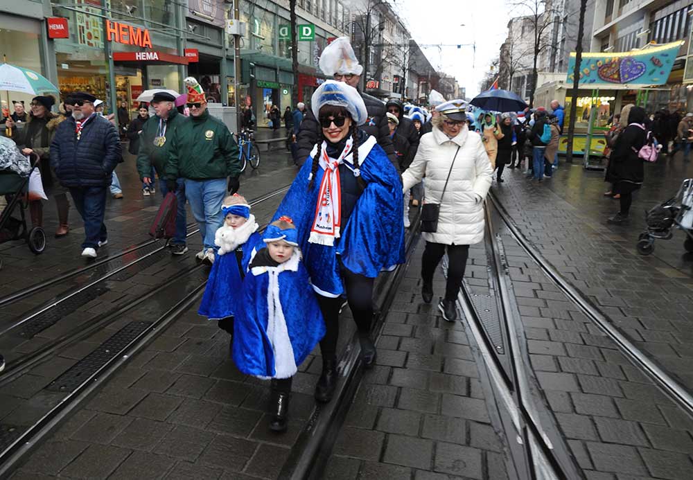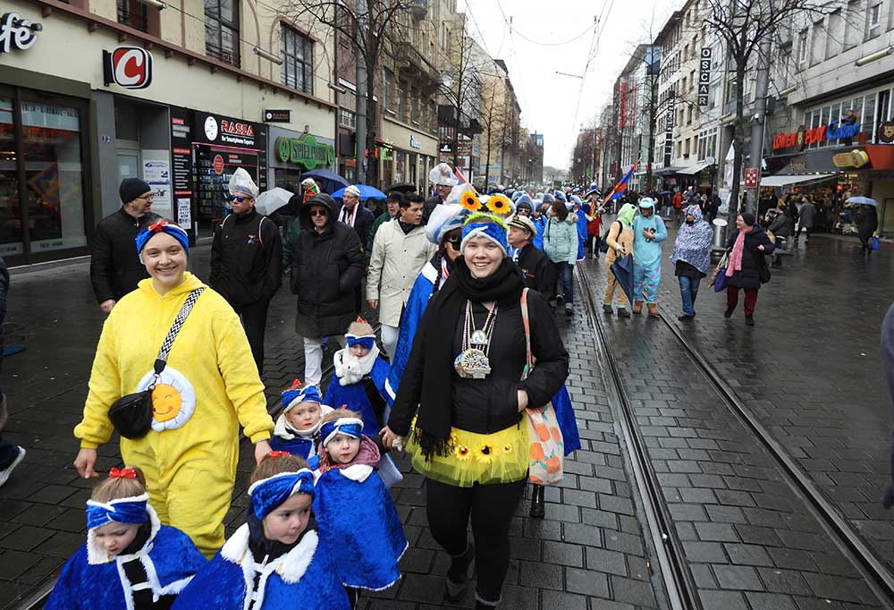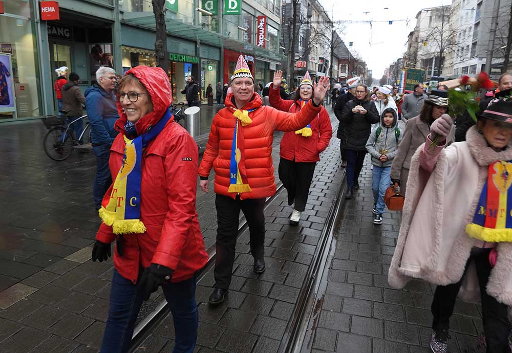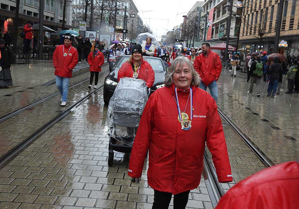 Gegen 11.30 Uhr gingen alle gut gelaunt von Bord mit AHOI , Musik und guter Laune wurden alle von den Elferräten, Garden, Senatoren und den Vereinsmitgliedern in Empfang genommen, gemeinsam ging es zum tradtionellen „ kleinen Umzug“. Zahlreiche Prinzessinen, die Elferräte, Garden und weitere Narren waren am „Start“, trotz Regen. Von der Kurpfalzbrücke bis zum Wasserturm liefen die Narren, auch der Regen konnte der guten Laune nichts anhaben. Leider standen nicht soviele Fastnachter am Straßenrand, dafür hatten die einkaufen waren, ihren Spaß vorallem die Kinder.