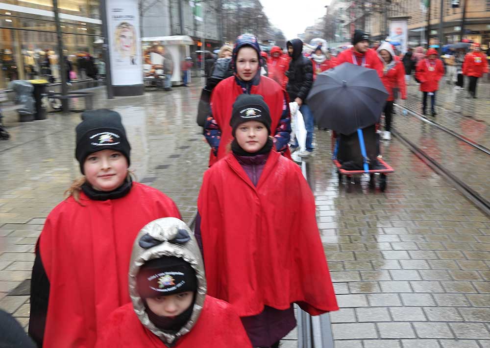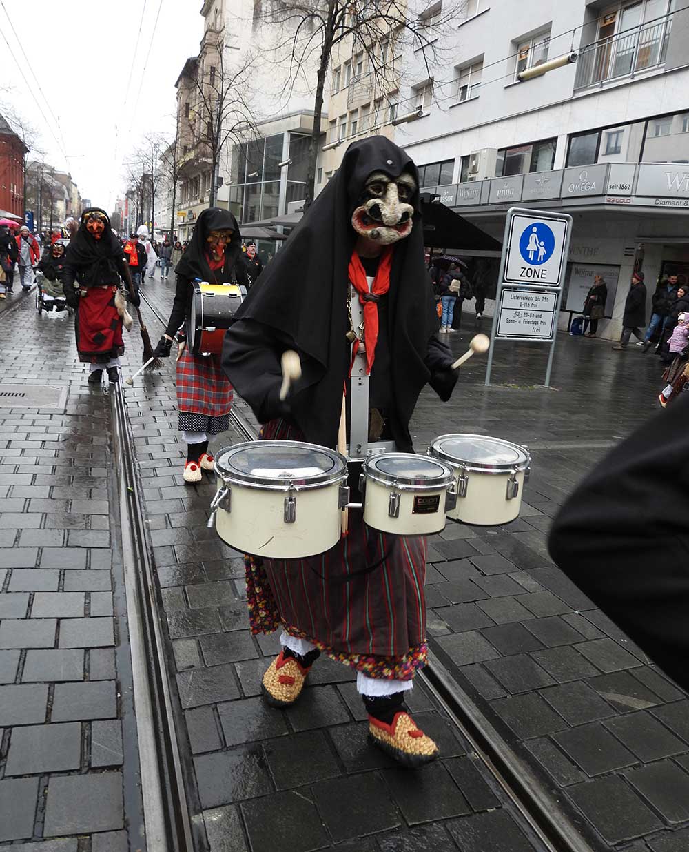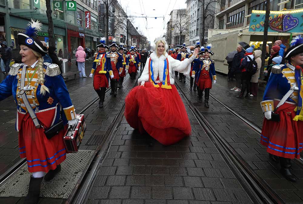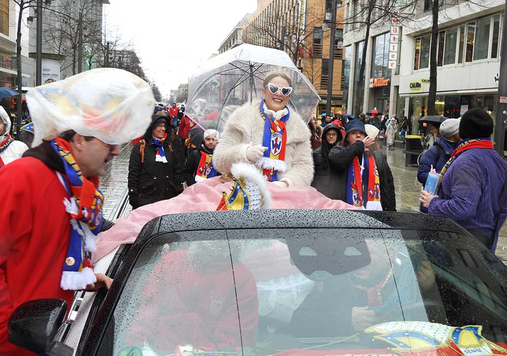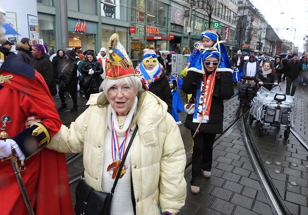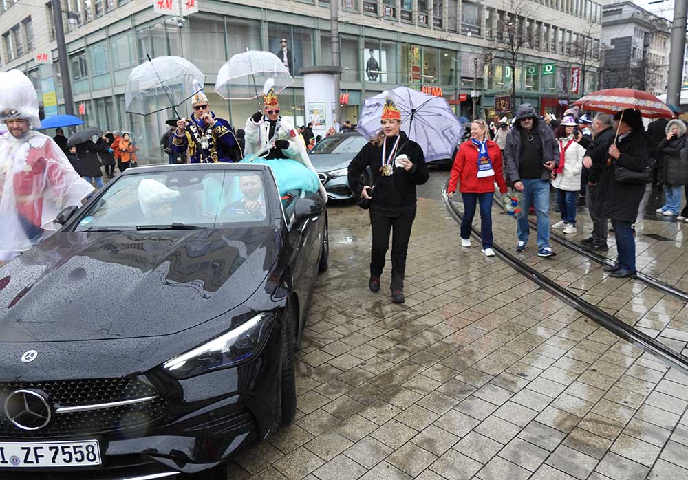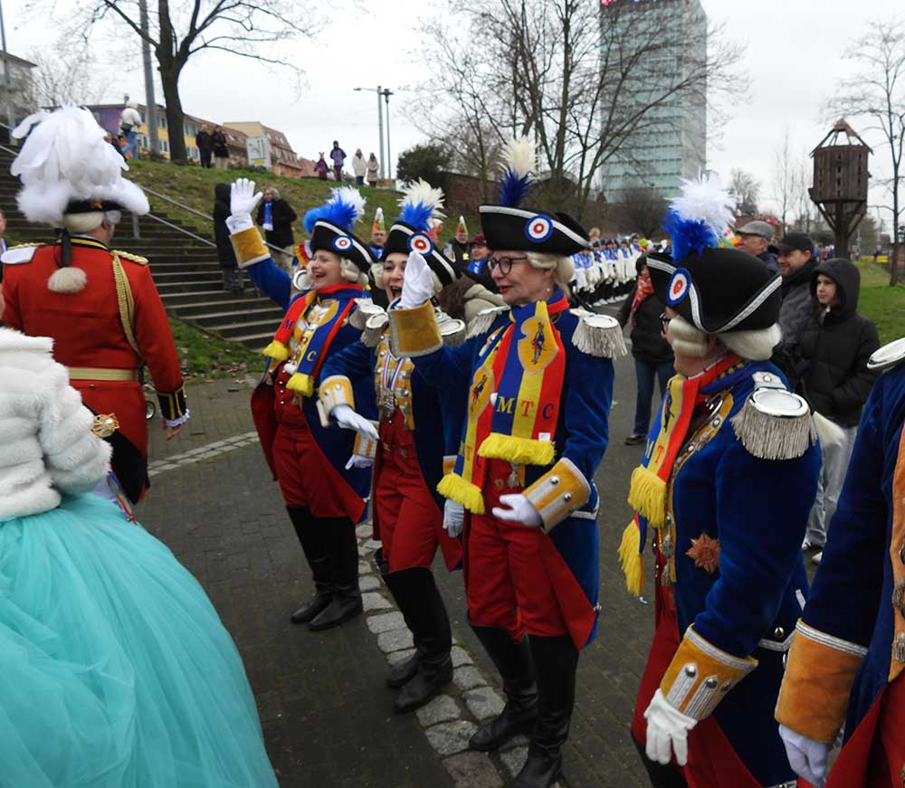 Gegen 11.30 Uhr gingen alle gut gelaunt von Bord mit AHOI , Musik und guter Laune wurden alle von den Elferräten, Garden, Senatoren und den Vereinsmitgliedern in Empfang genommen, gemeinsam ging es zum tradtionellen „ kleinen Umzug“. Zahlreiche Prinzessinen, die Elferräte, Garden und weitere Narren waren am „Start“, trotz Regen. Von der Kurpfalzbrücke bis zum Wasserturm liefen die Narren, auch der Regen konnte der guten Laune nichts anhaben. Leider standen nicht soviele Fastnachter am Straßenrand, dafür hatten die einkaufen waren, ihren Spaß vorallem die Kinder.