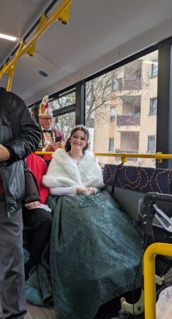 Viernheim (Vo) – Altweiberfastnacht in Viernheim, da ist der Karnevalsclub Club der Gemütlichen (CdG) immer unterwegs. So wurde Jubiläumsprinzessin Valentina I. und ihr Elferrat von der Stadt Viernheim zur närrischen Busfahrt eingeladen. Bürgermeister Matthias Baaß und Erster Stadtrat Jörg Scheidel, nahmen die Lieblichkeit und ihr Gefolge in der Innenstadt in Empfang. Dann fuhr man gemeinsam bei der närrischen Busfahrt durch Viernheim, im Bus herrschte gute Stimmung, unter anderem wurde das Prinzessinnenlied gesungen.