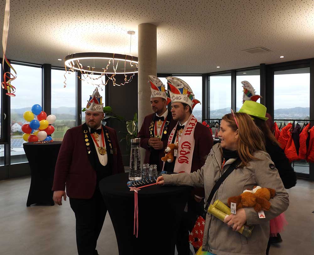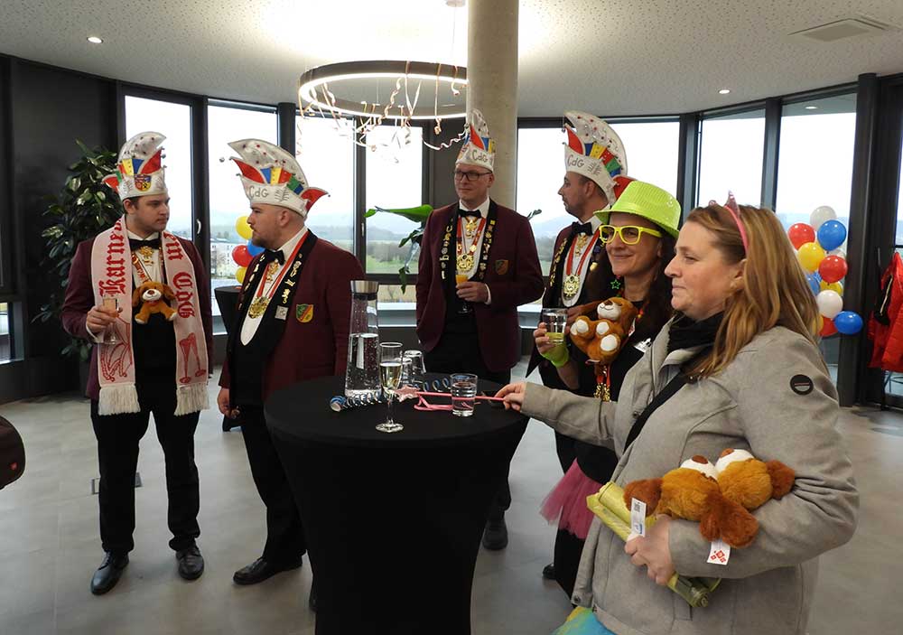 Nach rund 30 Minuten kamen die Narren am neuen Rathaus an, als erstes bekam Valentina das beliebteste Produkt vom Rathaus überreicht, nämlich zwei Rollen gelbe Säcke.