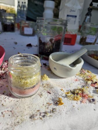Essbare frische Blüten, die gemeinsam im Wurzelblüte-Garten gesammelt wurden, sowie getrocknete Blüten wurden im Mörser zu farbenfrohem Blütenzucker verarbeitet. Danach stellte die Gruppe im Mixer eine Masse her, aus der Energiekugeln gedreht wurden. Diese wurden in gemörserten getrockneten Blüten, Blütenzucker und
