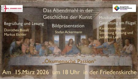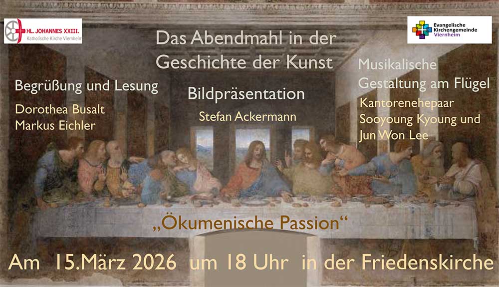 Viernheim (D.Busalt) – Die Evangelische Kirchengemeinde und die katholische Pfarrei Hl. Johannes XXIII. laden in der Passions- bzw. Fastenzeit zu einer Veranstaltung besonderer Art ein :eine kunsthistorische Präsentation, wie zu ganz verschiedenen Zeiten, ganz unterschiedliche Maler sich das „Letzte Abendmahl“ vorgestellt und ästhetisch gestaltet haben. Dafür konnte der Viernheimer Literatur -und Kunstexperte Stefan Acker-mann gewonnen werden, der in einem Bilder -und kenntnisreichen, unterhaltsam dargebotenen Vortrag die Darstellung der „ultima cena“ in der Geschichte der Kunst von der byzantinischen Spätantike und Giotto über das deutsche Mittelalter, die florentinische Früh- und die römische Hochrenaissance, den venezianischen Manierismus bis in die Moderne bei Nolde und Warhol dokumentieren und interpretieren wird. Es wird dabei um die interessante Frage gehen, wie theologische Inhalte (das eucharistische „Brotbrechen“, die Ankündigung des Verrats und die Reaktion des Judas und der anderen Jünger darauf) bildkünstlerisch umgesetzt werden und welche bedeutsame Rolle Mimik und Gesten, Farben und Räume bei der ästhetischen Umsetzung der theologisch brisanten Motive spielen. Gemeindereferentin Dorothea Busalt und Pfarrer Markus Eichler werden die entsprechenden kurzen biblischen Textpassagen lesen. Das Kantorenehepaar Sooyoung Kyoung und Jun Won Lee wird die Veranstaltung musikalisch umrahmen: am Sonntag, den 15.März um 18 Uhr (also nach Schließung der Wahllokale!) in der Friedenskirche. Der Eintritt ist frei. Um eine Spende für die Mannheimer Vesperkirche wird gebeten.