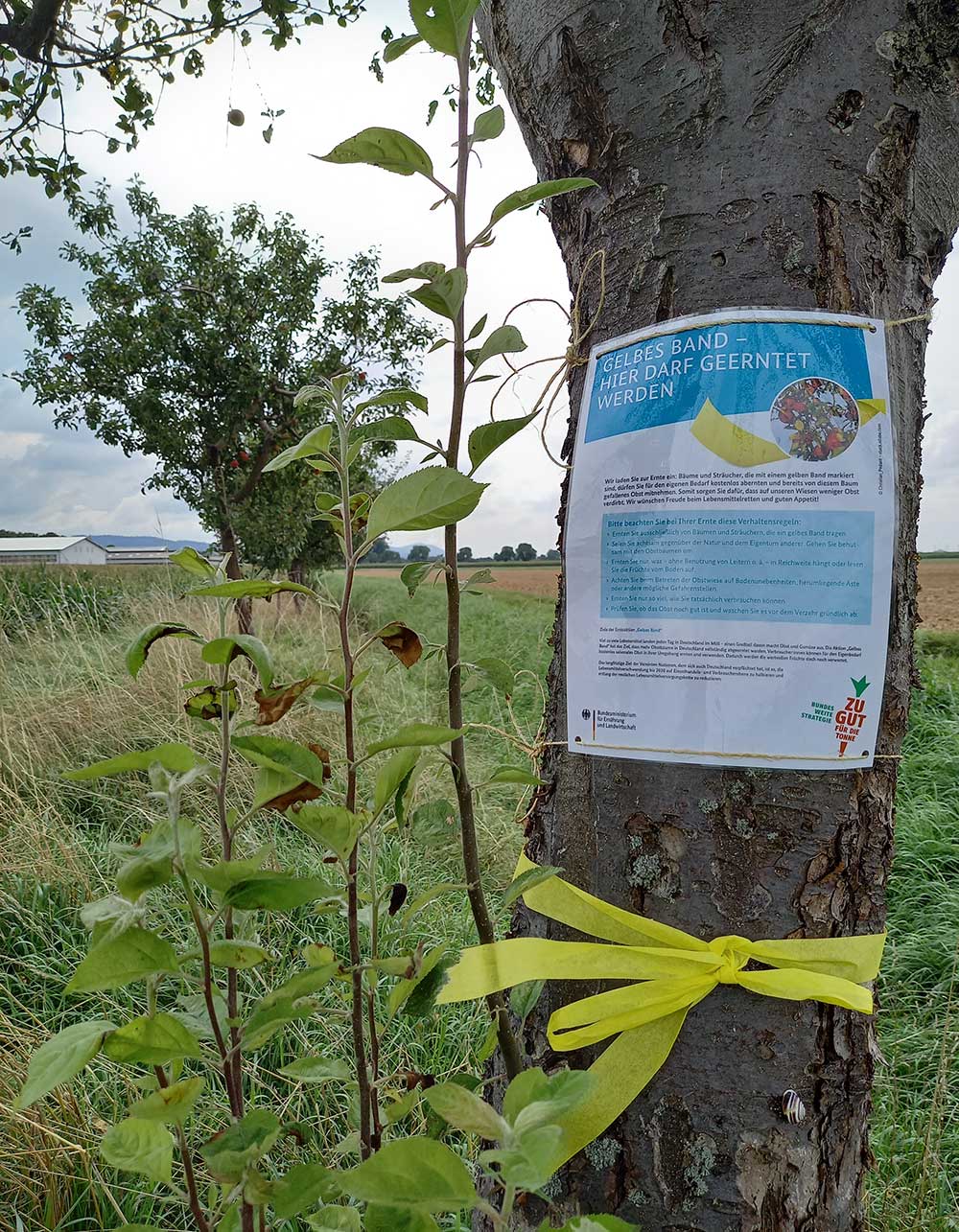 Gerne können Bürger auch ihre eigenen Obstbäume zur Ernte zur Verfügung stellen und mit einem gelben Band markieren. Informationen über die Aktion gibt es unter https://www.zugutfuerdietonne.de/blog/schwerpunkt/ernteaktion-gelbes-band-hier-darf-geerntet-werden.