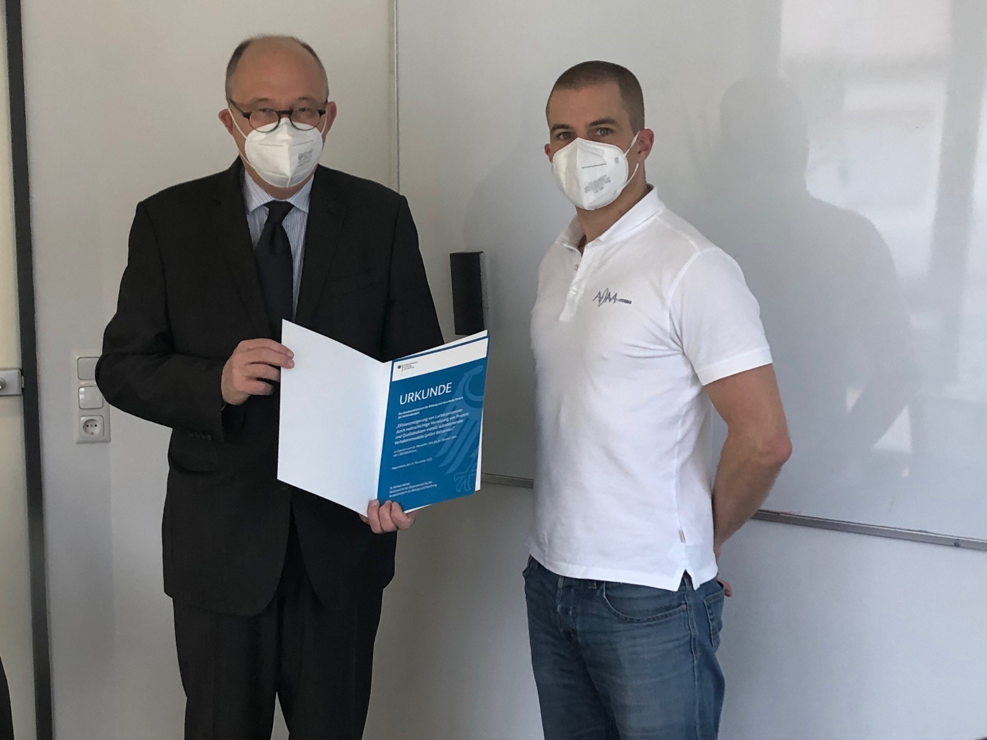 AOM-Systems GmbH. Meister überreichte Dr. Meiko Hecker von der Geschäftsführung eine Urkunde über einen Förderbescheid. Das Bundesministerium für Bildung und Forschung unterstützt das Vorhaben „Effizienzsteigerung von Lackierprozessen durch mehrschichtige Vernetzung von Prozess- und Qualitätsdaten mittels selbstlernender Verhaltensmodelle (kurz: pAInt-Behaviour)“ mit einer Summe in Höhe von insgesamt 1,307 Millionen Euro. Hecker dankte dem Parlamentarischen Staatssekretär und erklärte, dass eine solche finanzielle Förderung für ein junges Start-up-Unternehmen extrem wichtig sei. Seine Firma habe sich aus Absolventen der TU Darmstadt gegründet. Sie entwickle mit Hilfe von „optische Messverfahren und selbstlernende Software-Algorithmen (also Künstliche Intelligenz)“ Hightech-Messgeräte und Sensoren. Diese Geräte kommen in der Forschung und Entwicklung von Sprays sowie in der Inline-Qualitätskontrolle von Produktionsprozessen zum Einsatz. Hecker erklärte am Beispiel der Lackierung von Neufahrzeugen, dass nicht nur der Fertigungsprozess verkürzt und optimiert, sondern sogar noch die Kosten und der Ressourcenverbrauch um ein Vielfaches reduziert werden könnten. Insbesondere können die von seiner Firma entwickelten Geräte Fehler sofort korrigieren oder auch selbstständig auf andere Anforderungen eingehen. Diese Technik sei bei allen Verfahren, bei dem zerstäubte Flüssigkeiten verarbeitet werden, zur Anwendung, seien es Kraftfahrzeuge oder auch Medikamente. Das entwickelte System SpraySpy nutze eine patentierte laserbasierte Messtechnologie, welche die Spray-Parameter jedes einzelnen Tropfens im Spray individuell ermittle. Hecker wies darauf hin, dass die Geräte seiner Firma so gebaut würden, dass ein Ausspähen der Technologie nur schwer möglich sei. Letztendlich müsse es aber Ziel seiner Firma sein, die Geräte immer weiter zu entwickeln, so dass ein Diebstahl anderer nicht sinnvoll sei, da diese dann nur eine veraltete Version hätten. Gerade auch hierfür sei die Förderung extrem wichtig. In Zusammenarbeit mit dem Fraunhofer-Institut für Produktionstechnik und Automatisierung (IPA) ist Hecker sich sicher, dass eine sinnvolle und gute Weiterentwicklung gerade der selbstlernenden Messgeräte erfolge. Die Patente seien für seine Firma durchaus wichtig, allerdings dauerten Patenstreitigkeiten zu lange, weshalb er mehr auf Innovation setzt. Meister betonte, dass gerade auch mit der Förderung jungen Start-up-Unternehmen geholfen werde. Er sei froh, bei einem jungen Unternehmen den Förderbescheid persönlich übergeben zu können. Gerade in einem weltweiten Wettbewerb entstünden immer neue Produkte, Leistungen Technologien Geschäftsmodelle und Kundenbeziehungen. Eine Wettbewerbsposition sei nicht dauerhaft gesichert, sondern müsse ständig neu errungen werden. Meister lobte die Firma AOM und erklärte, dass die Förderung gerade auch den hohen Innovationsgrad im Unternehmen zeige. Hecker weis dies sehr zu schätzen. Die Pandemie sei für seine Firma allerdings derzeit ein großes Handicap In vielen Firmen setzte man zunächst auf Bewährtes, da es ja funktioniere. Nur auf Messen komme man mit den entsprechenden Firmen in Kontakt. Da diese derzeit ausfallen, sei es für seine Firma derzeit nicht einfach, neue Anwender zu finden. Allerdings sei gerade eine solche Förderung auch eine starke Motivation, die Firma voranzutreiben.