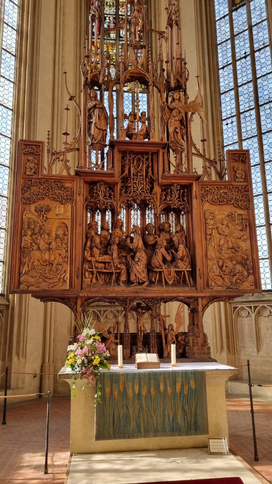 Der Besuch des Hohen Doms St. Peter ließ dann schnell allen Trubel und Gesang vergessen. Beim Eintritt in den Dom umfasst den Besucher eine große Dunkelheit und Stille. So mag es auch schon den Menschen im Mittelalter ergangen sein: ein dunkler, hoher, schlanker, gotischer Raum, mit bunten, kleinteiligen, eher dunklen Fenstern. Doch wer weiter in den Raum hineingeht, erblickt im Osten über dem Altarraum das Licht, wenn morgens hier die Sonne hereinscheint. Dabei sticht der prunkvolle Hochaltar aus Silber und vegoldetem Kupfer ins Auge. Diese Atmosphäre wird auch heute noch bewusst beibehalten, um den Dom auch den heutigen Besuchern in seiner ursprünglichen Wirkung erfahrbar zu machen. Schwer vorzustellen ist dabei die Tatsache, dass der Innenraum die verschiedenen Moden vergangener Jahrhunderte erlebte und zwischendurch mit hölzernen barocken Einbauten, Seitenaltären und Emporen ausgestattet war und die Figuren und Wände einst viel farbenfroher ausgestaltet waren.