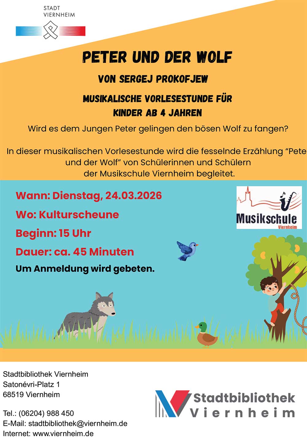 Viernheim (Stadt Viernheim) – Die Stadtbibliothek lädt in Kooperation mit der städtischen Musikschule zu einer besonderen musikalischen Vorlesestunde ein. Am Dienstag, 24. März 2026, um 15 Uhr steht in der KulturScheune, Wasserstraße 20, das bekannte Musikmärchen „Peter und der Wolf“ von Sergej Prokofjew auf dem Programm. Die Veranstaltung richtet sich an Kinder ab vier Jahren.