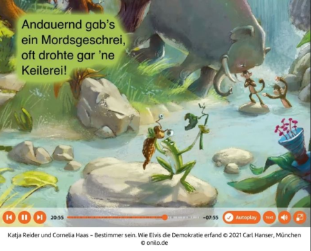 In der Geschichte geht es um Tiere, die darum streiten, wer der „Bestimmer“ im Wald sein darf – bis Hund Elvis eine Lösung findet, bei der alle gemeinsam entscheiden können. Damit vermittelt das Bilderbuch spielerisch die Grundidee der Demokratie. „Bereits Kinder und Jugendliche kann man gar nicht früh genug mit dem Wesen der Demokratie und ihren Werten vertraut machen. Dazu gibt es in der Stadtbibliothek sehr schöne und geeignete Medien“, betont das Team der Stadtbibliothek.